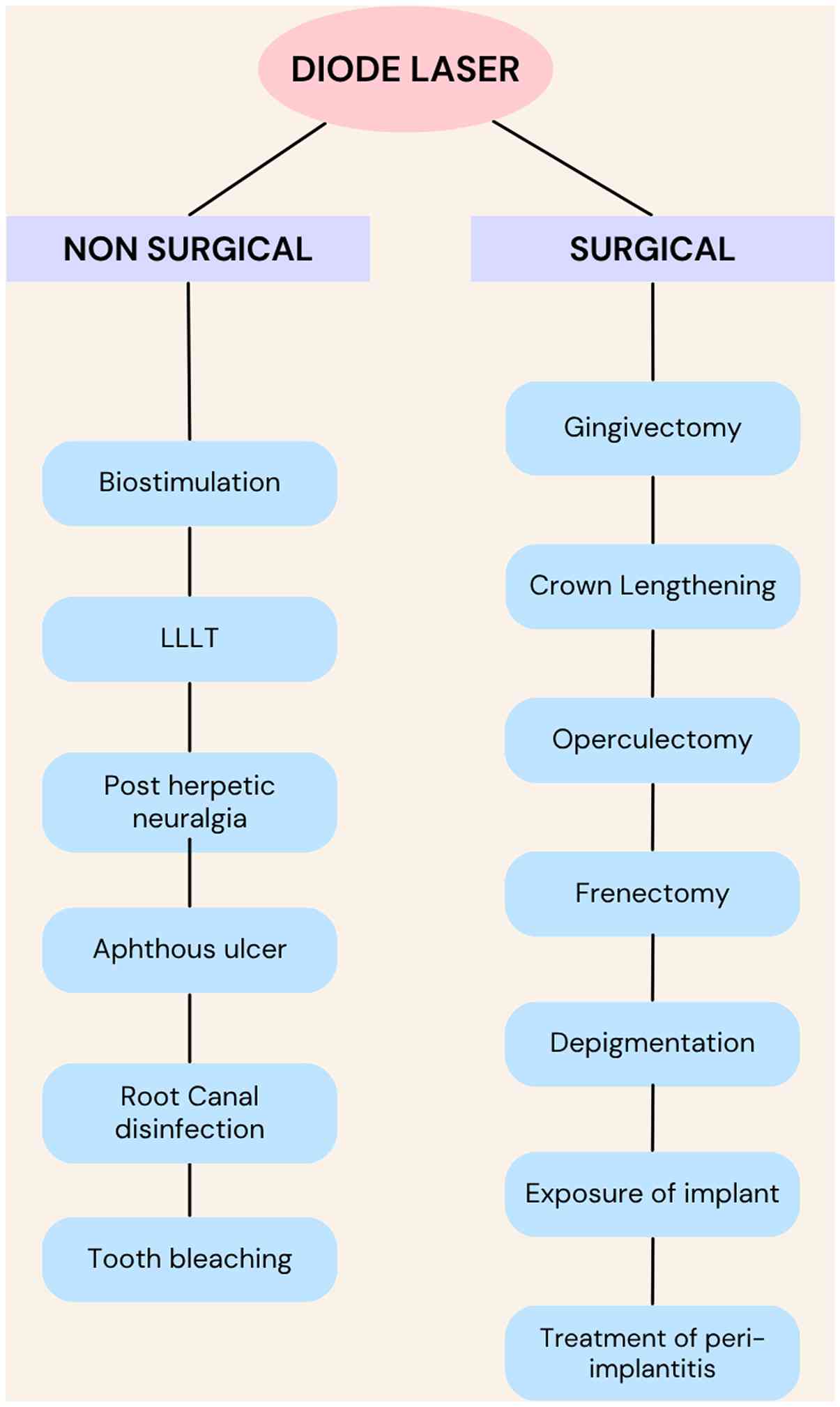 Diode laser technology and its various applications in dentistry date back to several decades; however, it has been in the past 10 years that diode lasers have gained a greater prominence owing to the immense technical development achieved and the materialization of affordable equipment for the dentist. All these advancements have allowed for the current use of lasers in numerous procedures to improve the performance of conventional therapies; however, this is not sufficient. The use of different diode laser therapies should be consolidated with further research. In recent years, progress has been made in this regard, as it has gained increasing prominence as an adjuvant therapy; however, although there are several notable in vitro and clinical studies available on the use of lasers (as aforementioned), further research is warranted to address laser therapy from a different perspective (43).