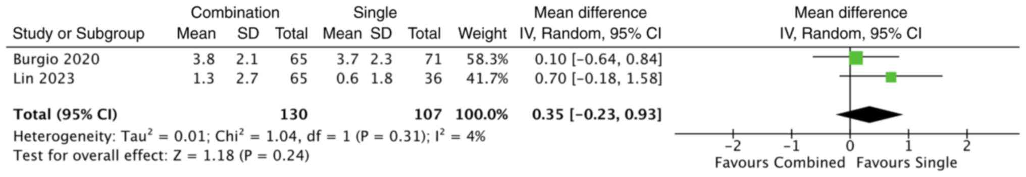 Lin et al (19) compared urge control behavioural therapy alone with a combination of behavioural therapy and mirabegron 50 mg. At 12 weeks, combination therapy resulted in a greater reduction in daytime voiding frequency compared with behavioural therapy alone (mean reduction, 1.3±2.7 vs. 0.6±1.8 episodes), although this difference did not reach statistical significance (P=0.198) (19). A quantitative synthesis of the two included studies using a random-effects model demonstrated no statistically significant difference between combination therapy and behavioural therapy alone in reducing daytime frequency (MD, 0.35; 95% CI, -0.23 to 0.93; P=0.24) (Fig. 3). Heterogeneity across studies was low (I2=4%).