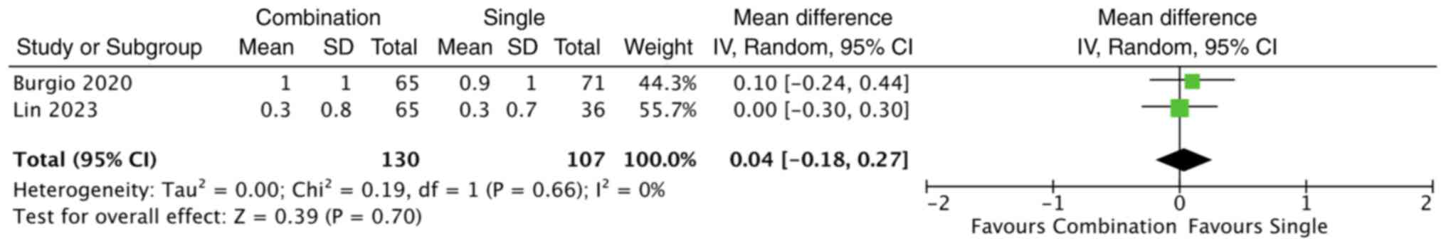 The studies by both Burgio et al (11) and Lin et al (19) evaluated changes in nocturia episodes; however, their findings were inconsistent. Burgio et al (11) reported a greater reduction in nocturia episodes with combination therapy, whereas Lin et al (19) observed no significant differences between the treatment groups. Consequently, a random-effects meta-analysis was conducted to estimate the overall effect of combination therapy compared with behavioural therapy alone. The pooled analysis demonstrated no statistically significant difference in nocturia reduction between the two groups (MD, 0.04; 95% CI, -0.18 to 0.27; P=0.70) (Fig. 4). No significant heterogeneity was observed among the studies (I2=0%).