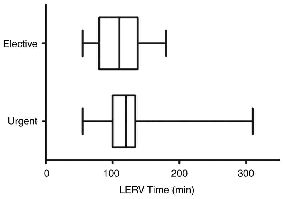 The median operative time across the cohort was 115 min (range, 55-310 min), with a mean of 118.9 min (± standard deviation, 42.5 min), reflecting variability based on procedure complexity. The association between urgent/elective intervention and operative time is depicted in Fig. 1. Operation times in the urgent group (n=36) were significantly more variable and exhibited a non-normal distribution (P<0.001), whereas the elective group (n=44) did not deviate from normality (P=0.068). The median operation time was 120 min (IQR, 100-134 min) for the urgent cases and 110 min (IQR, 80-137 min) for the elective cases. Comparisons between the groups revealed no statistically significant difference (P=0.139) (Fig. 1). The median duration of hospitalization was 3 days (range, 1-24 days) (Table I).