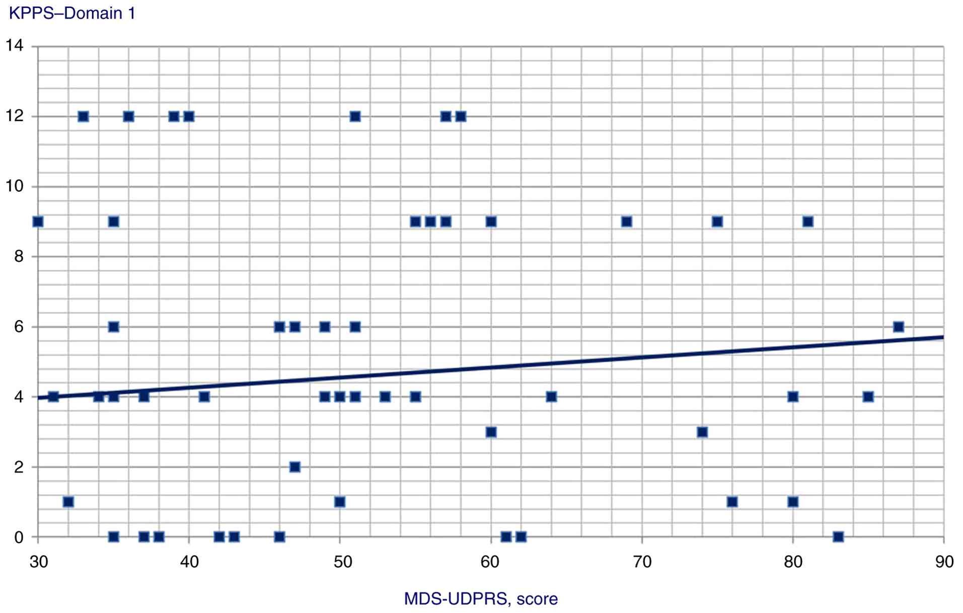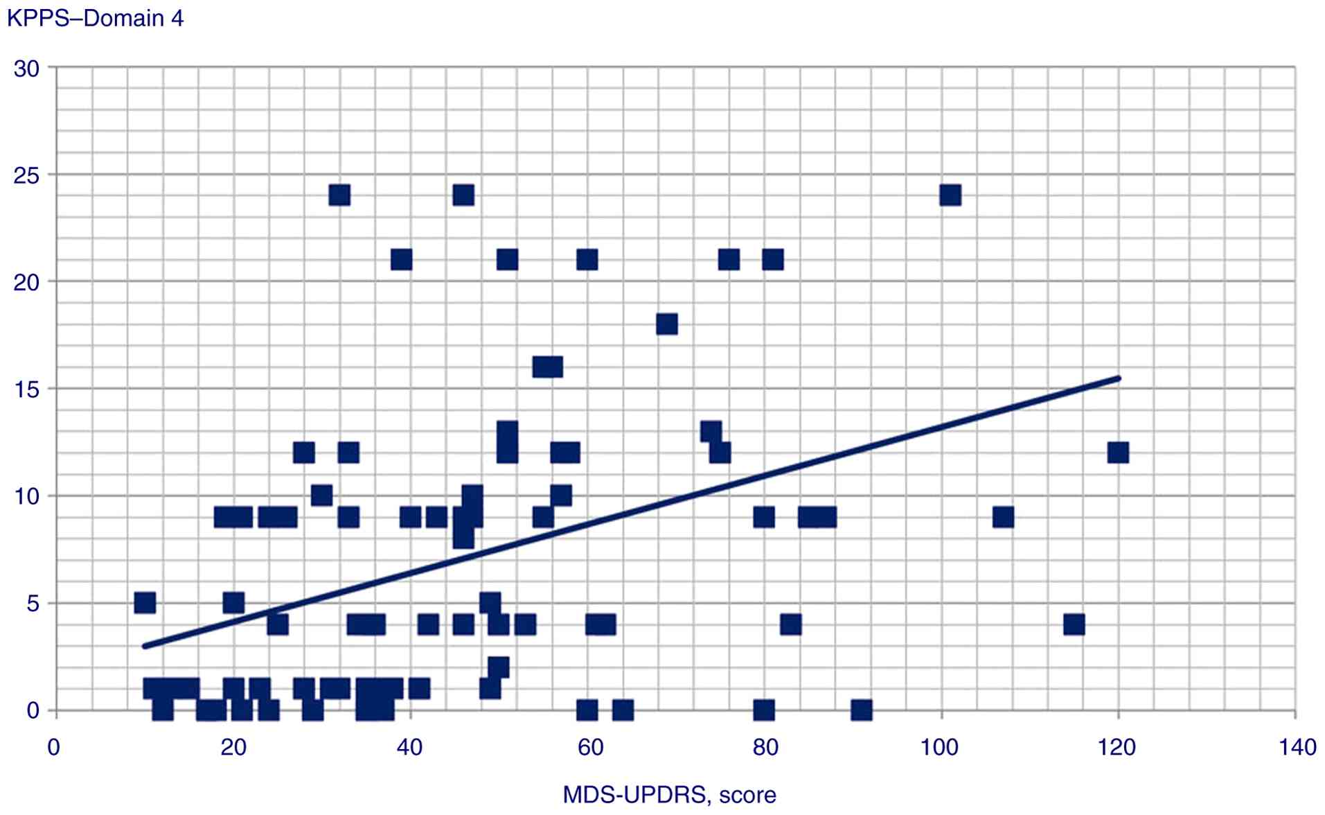Data analysis revealed moderate, positive correlations between the following variables: GAD score and KPPS total score (Pearson's r=0.4, P<0.001); MDS-UPDRS and Domain 4 score (Pearson's r=0.414, P<0.001).