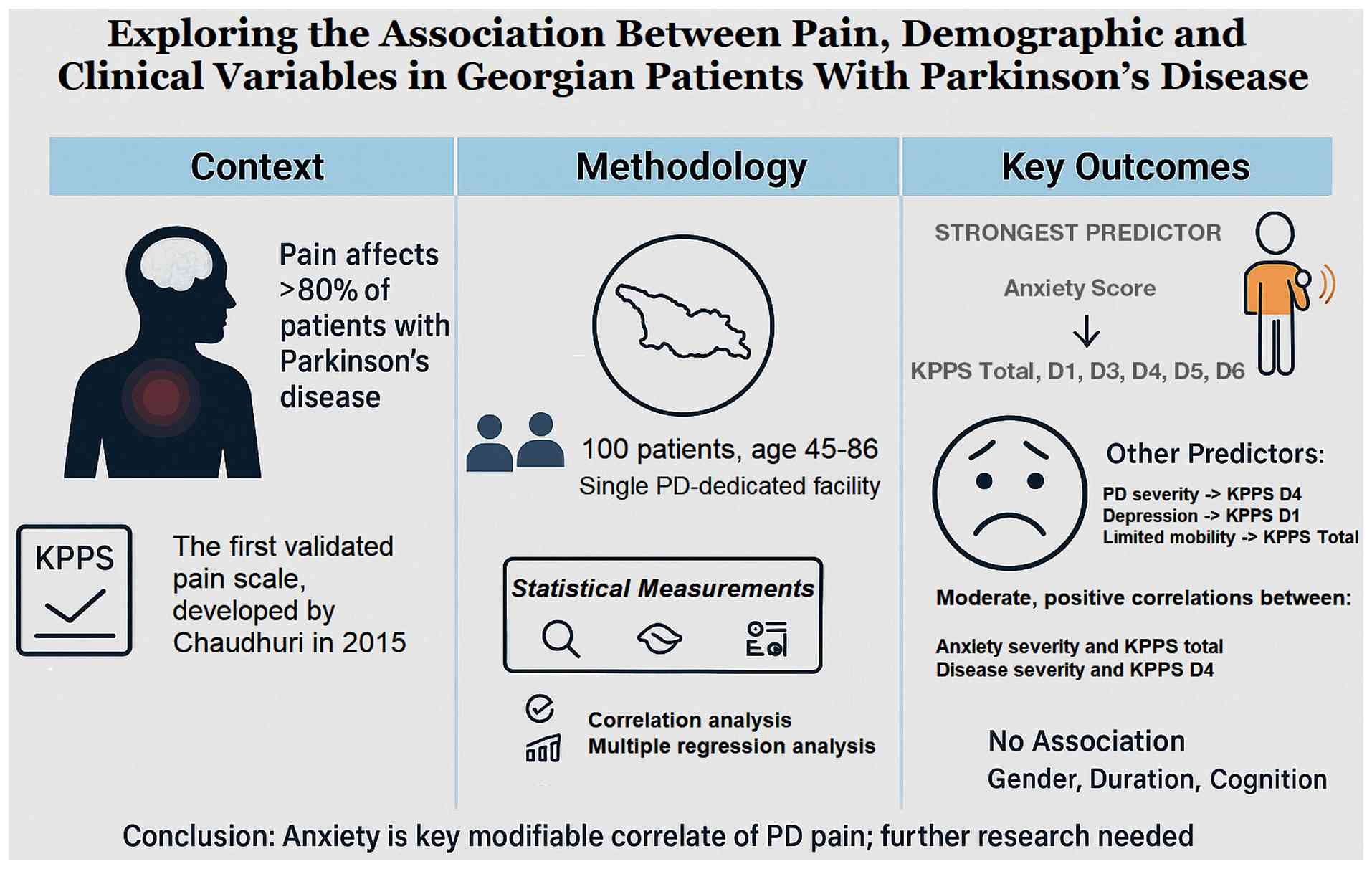 Considering the above, there is a need for further research regarding the association between clinical and demographic variables and PD-related pain. The majority of studies on the subject are performed in distinct, country-specific populations. The present study added Georgia to the geographic areas covered, and to the best of our knowledge, correlations with individual KPPS domains were explored herein for the first time.