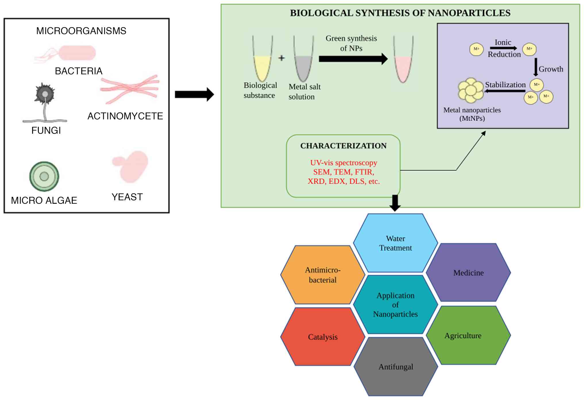 The synthesised nanoparticles are purified and characterised using techniques, such as scanning electron microscopy (SEM), UV-visible spectroscopy, X-ray diffraction (XRD) and transmission electron microscopy (TEM). In the green synthesis of nanoparticles, purification and characterisation are essential steps that ensure the quality, size, shape and functionality of the synthesised nanoparticles. After the nanoparticles are formed through the reduction of metal ions by biological agents (such as plant extracts, microorganisms, or enzymes), they must be purified to remove any residual reactants, by-products, or unreacted metal ions. This purification is typically achieved through methods, such as centrifugation, filtration, dialysis, or gel electrophoresis, which help separate the nanoparticles from unwanted materials. These methods rely on differences in particle size, charge, or solubility to isolate the nanoparticles in their purest form, ensuring that they are free from contaminants that could affect their properties or hinder their intended applications (6,80,92,93).