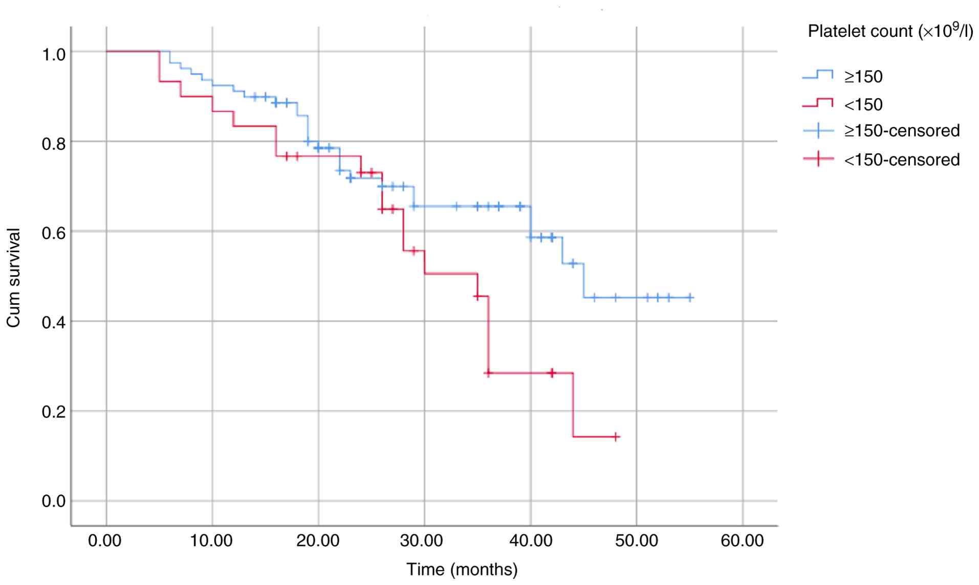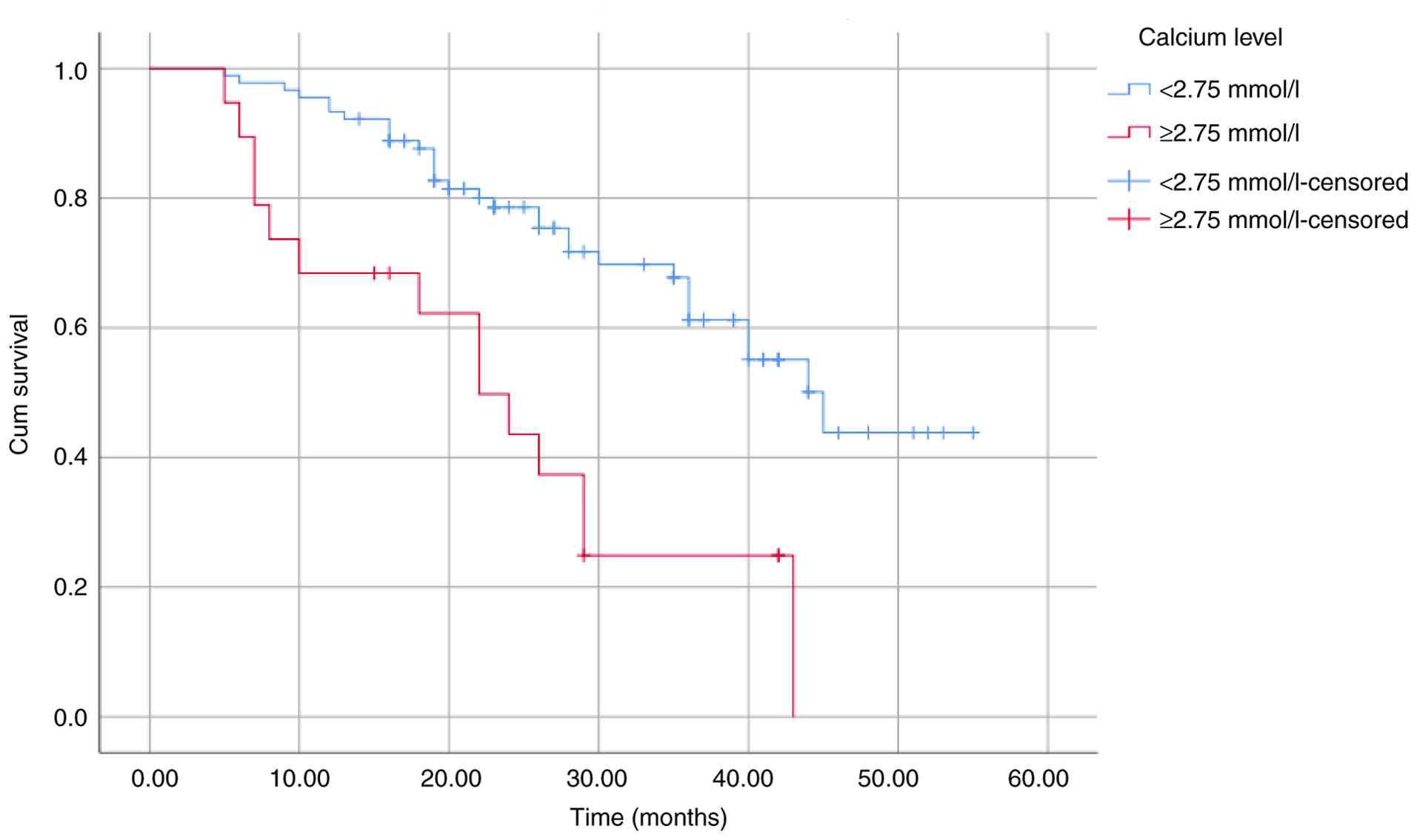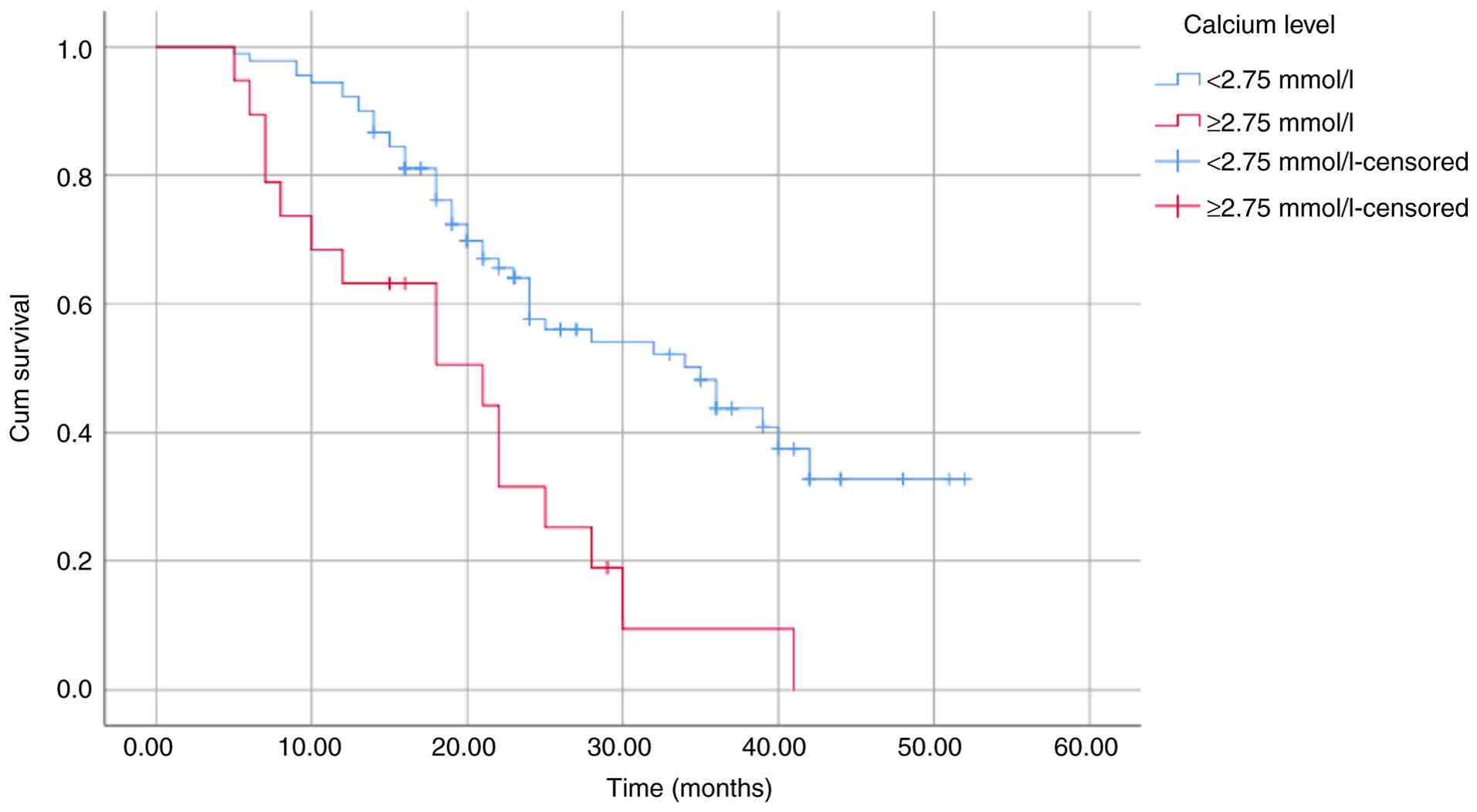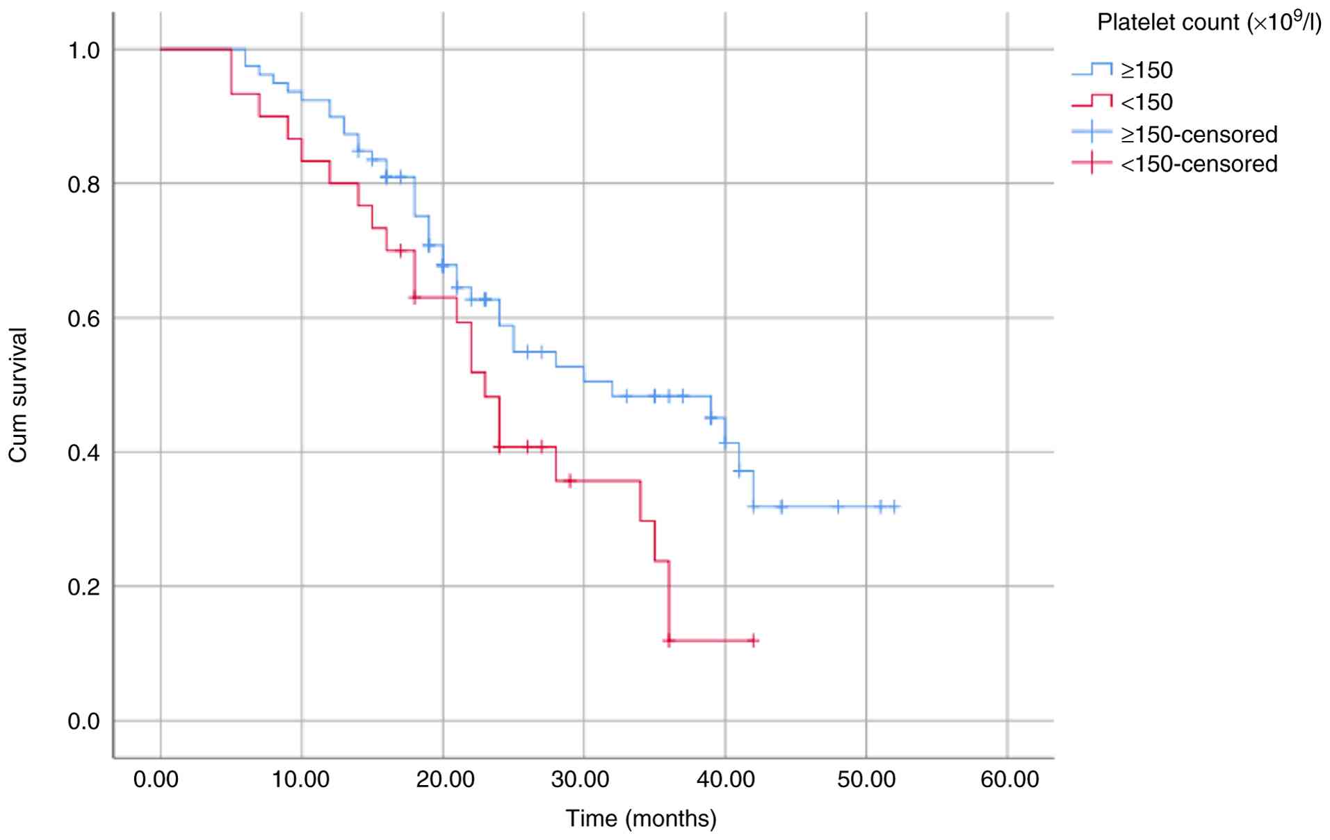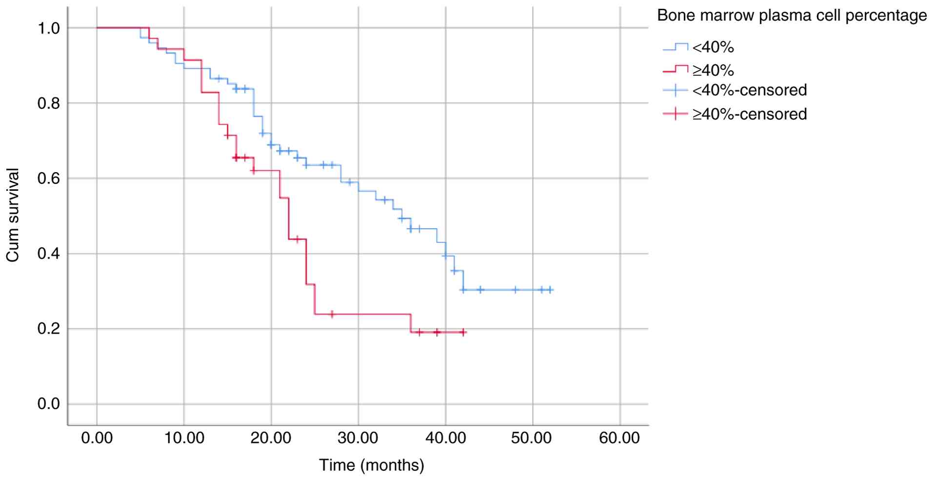 The results of the univariate analysis demonstrated that a low hemoglobin level (<100 g/l), low albumin level (<35 g/l) and high creatinine level (≥177 μmol/l) were not associated with survival outcomes in the present study cohort. This analysis indicated that a high β2M level (≥5.5 mg/l), PS score ≥2, elevated LDH level and high ISS stage were associated with a poor OS; however, these were not significantly associated with PFS. Among all variables examined, only a high bone marrow plasma cell percentage (≥40%), low platelet count (<150x109/l), high NLR (≥2.1) and a high calcium level (≥2.75 mmol/l) were factors for a poor prognosis and significantly associated with both OS and PFS (Table III). These differences were further illustrated using Kaplan-Meier survival curves (Fig. 2, Fig. 3, Fig. 4, Fig. 5, Fig. 6, Fig. 7, Fig. 8 and Fig. 9).