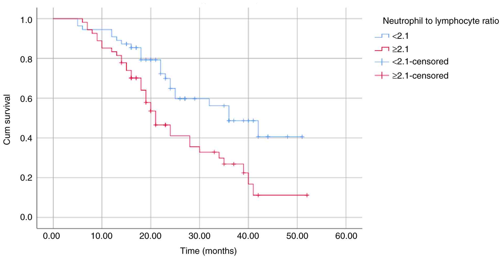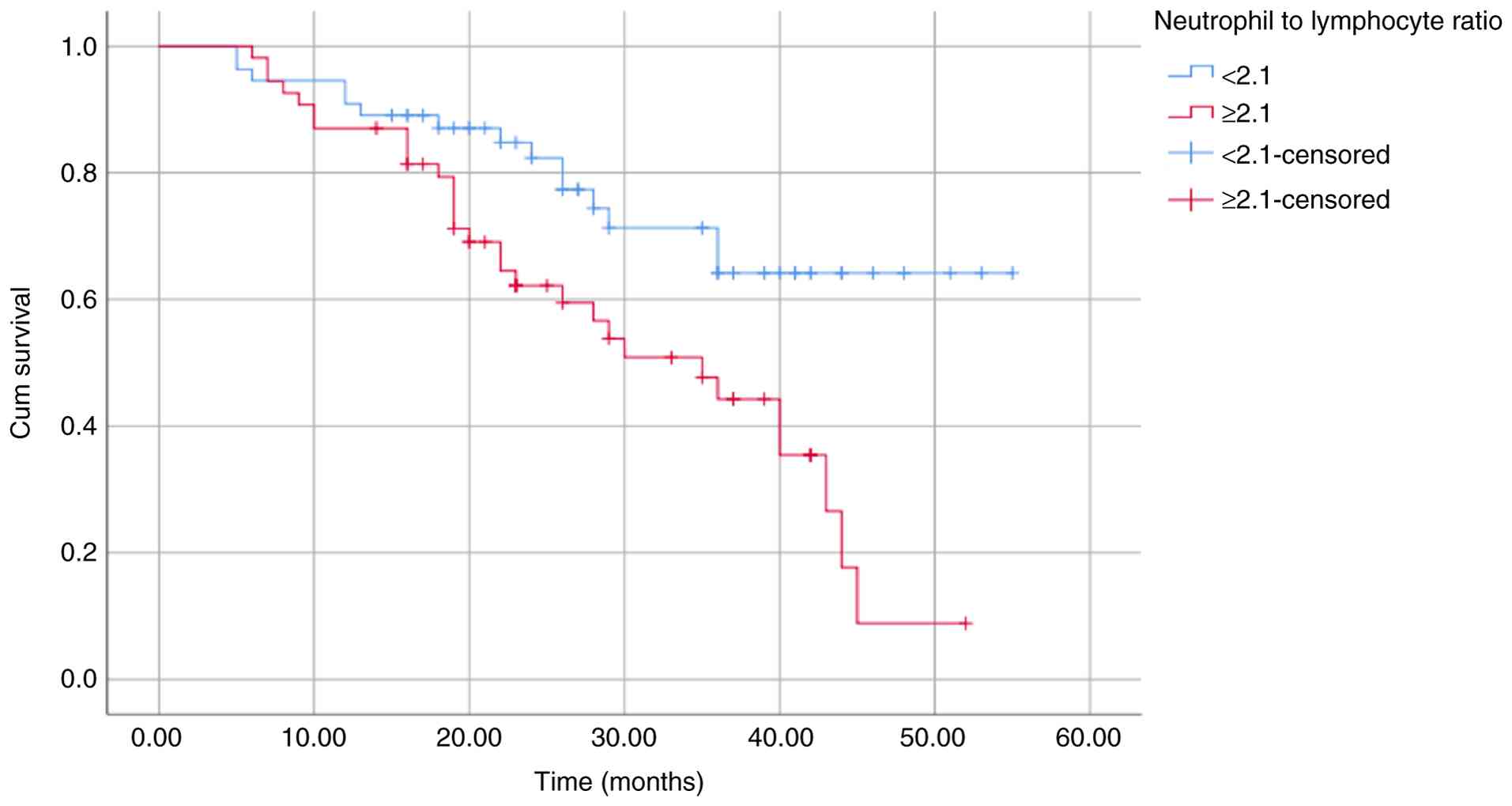 To date, the International Staging System (ISS) and the Revised International Staging System (R-ISS) have been considered the two most critical and widely used systems in the prognosis of MM. However, ISS was developed from the results of treatment prior to the use of the current regimen, and it was not as strongly associated with PFS as it was with OS (10-12). Despite its suitability for current treatment strategies, R-ISS requires fluorescence in situ hybridization (FISH) techniques that are time consuming and costly (13,14). Moreover, the second revision (R2-ISS) that includes gain/amplification of 1q21 is also time consuming and costly (15). Thus, numerous studies have focused on determining novel prognostic factors that are suitable for updated treatment strategies, ensuring both convenience and cost. Notably, the high neutrophil to lymphocyte ratio (NLR) has been proposed as a poor prognostic factor. Over the past 10 years, numerous previous studies have evaluated NLR; however, an accurate cut-off value is yet to be established, while numerous other prognostic factors have exhibited its use in clinical practice, with well-established cut-off values; for example, hemoglobin (<100 g/l) and platelet count (<150x109/l) (16-27). Thus, the prognostic value of NLR has yet to be widely used in clinical practice. Moreover, recent studies with large datasets did not include NLR in the prognosis of MM (28-31), and two studies even demonstrated that NLR did not play a key role in predicting the short-term survival of patients diagnosed with MM (32,33). It appears that the prognostic role of NLR in multiple myeloma warrants further investigation. Thus, the present study aimed to determine the value of NLR in the prognosis of patients with diagnosed MM, compared with other prognostic indices.