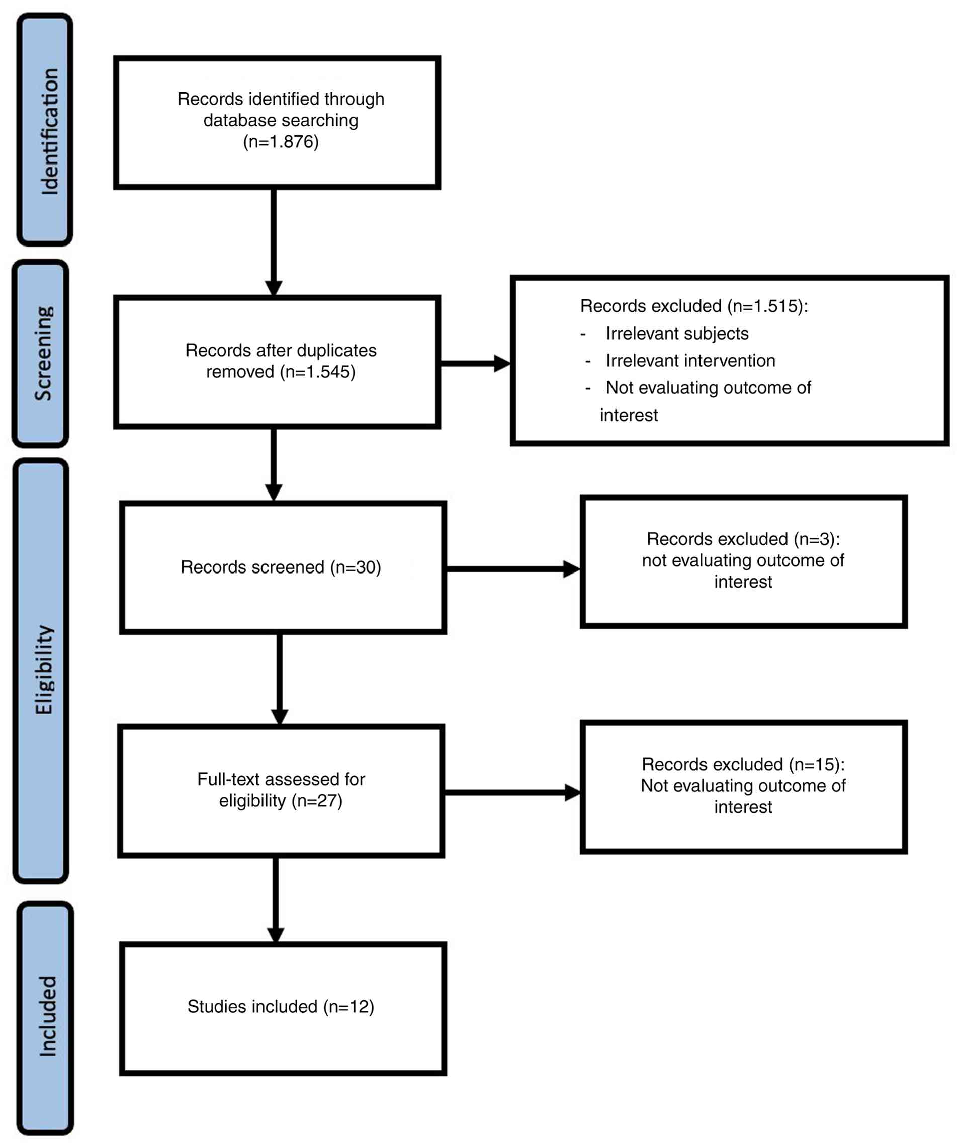 The initial search for studies identified 1,876 studies; after excluding duplicates and screening for the established criteria, 12 studies were determined to be eligible for inclusion in the present meta-analysis. The PRISMA flowchart illustrating the systematic literature search is presented in Fig. 1.