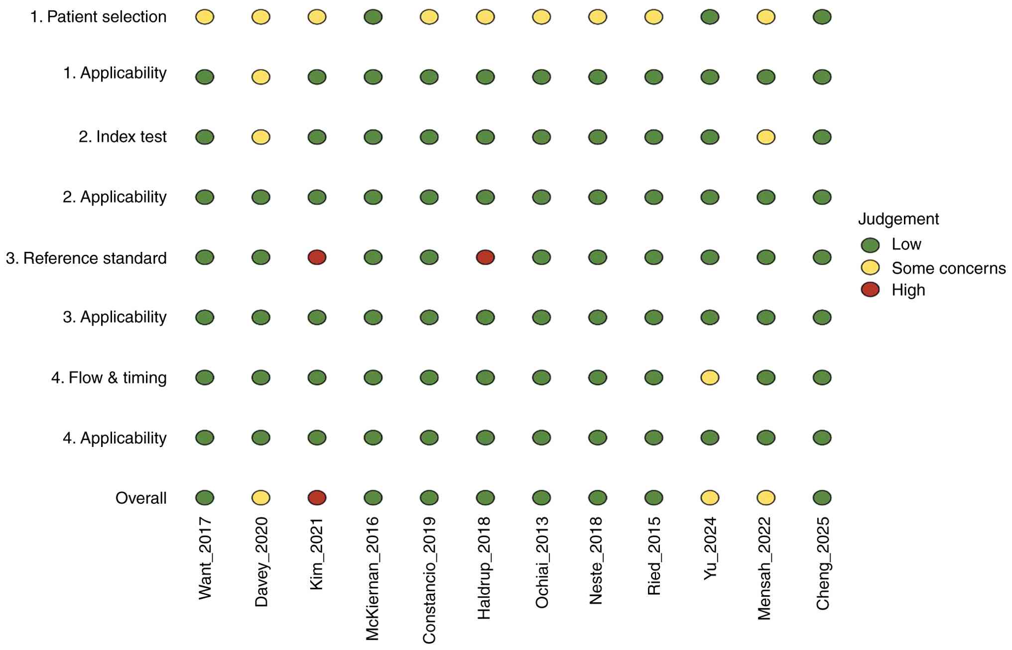 The risk of bias and applicability were evaluated independently by two authors (FES and FR) using the Quality Assessment of Diagnostic Accuracy Studies-2 (QUADAS-2). The following four domains were assessed: Patient selection, index text, ‘reference standard, and flow and timing, and judged these as high, unclear, or low.