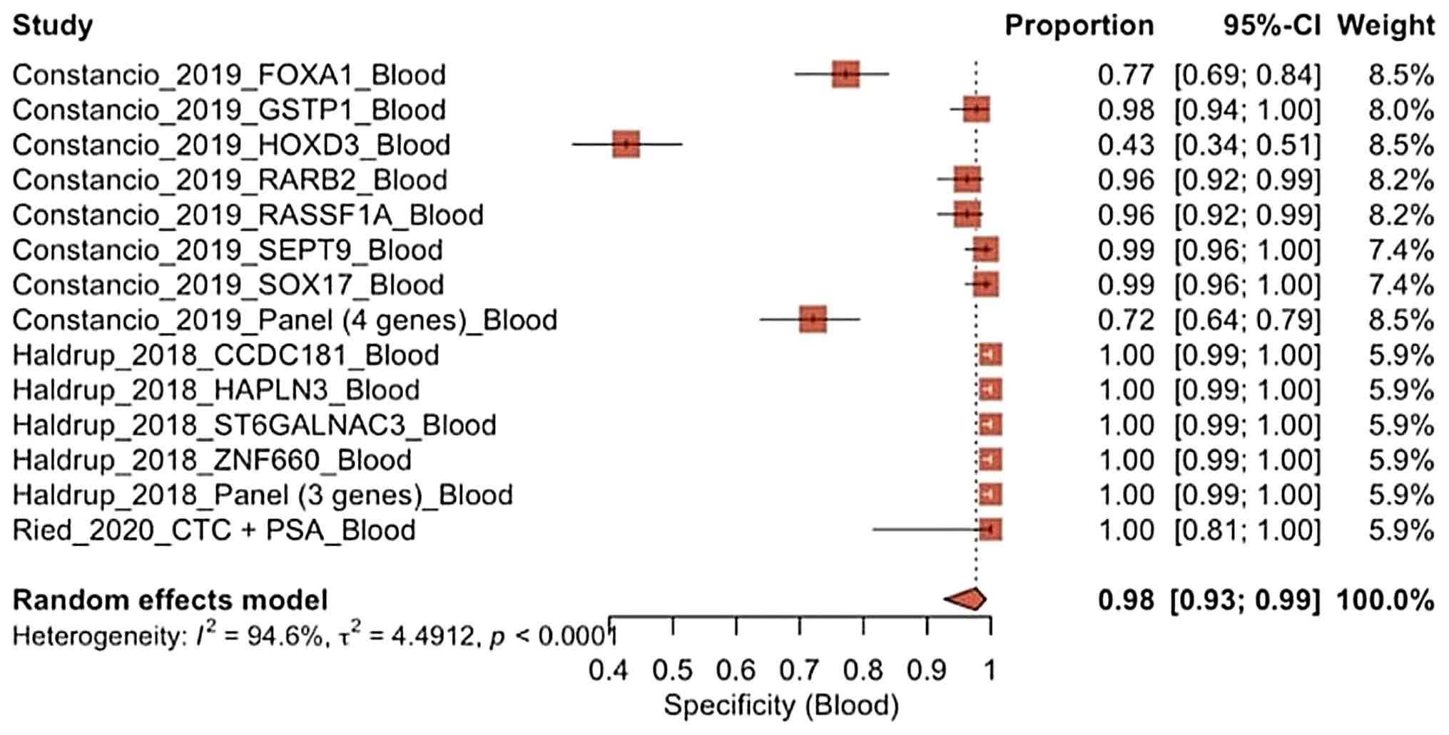 The specificity forest plot of blood biopsy vs. urine biopsy using the random effects model (Fig. 7) revealed a wide variation in diagnostic performance of 12 different studies. Blood-based biomarkers generally exhibited very high specificity, with the majority of values approaching 1.00 and relatively narrow confidence intervals, particularly in the study by Haldrup et al (14) and the gene panel in the study by Constancio et al (13).