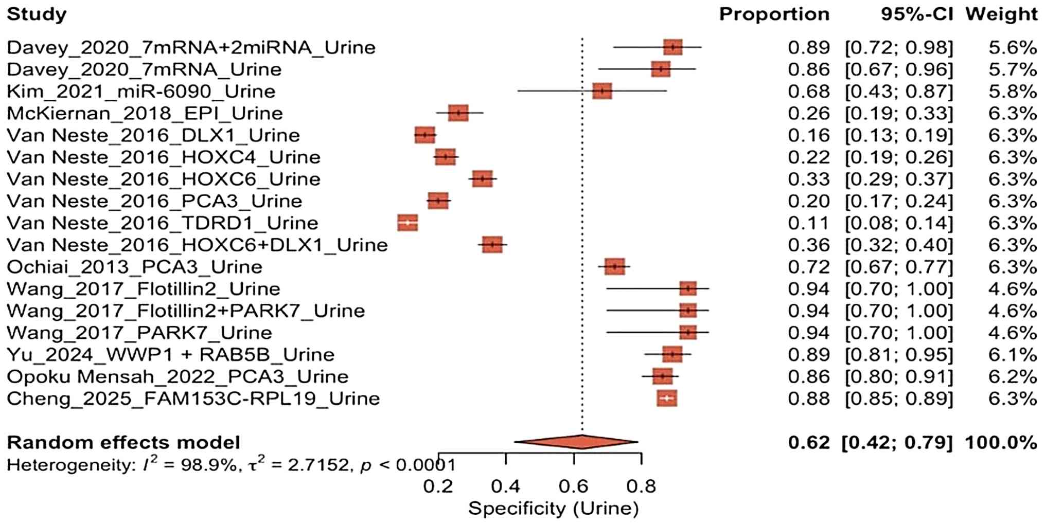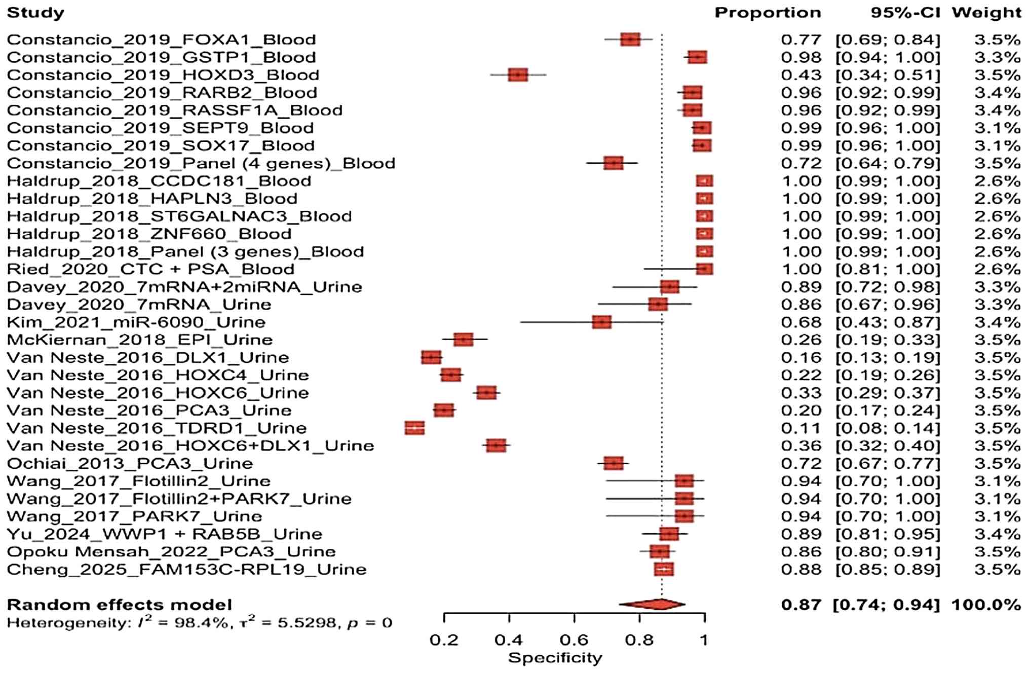 Blood-based biomarkers generally exhibit very high specificity, indicating that these biomarker effectively exclude non-cancer individuals with a low risk of false positives. By contrast, urine biomarkers display a wider range of specificities, from low to moderate, which can lead to a higher rate of false positives in certain groups. However, some urine biomarkers, such as the Flotillin2 + PARK7(15) or WWP1/RAB5B panels (19) demonstrate a high specificity. This difference underscores that the specificity of urine biomarkers is highly dependent on the type of biomarker and the analytical platform used. The observed heterogeneity also reveals significant variation across different studies.
