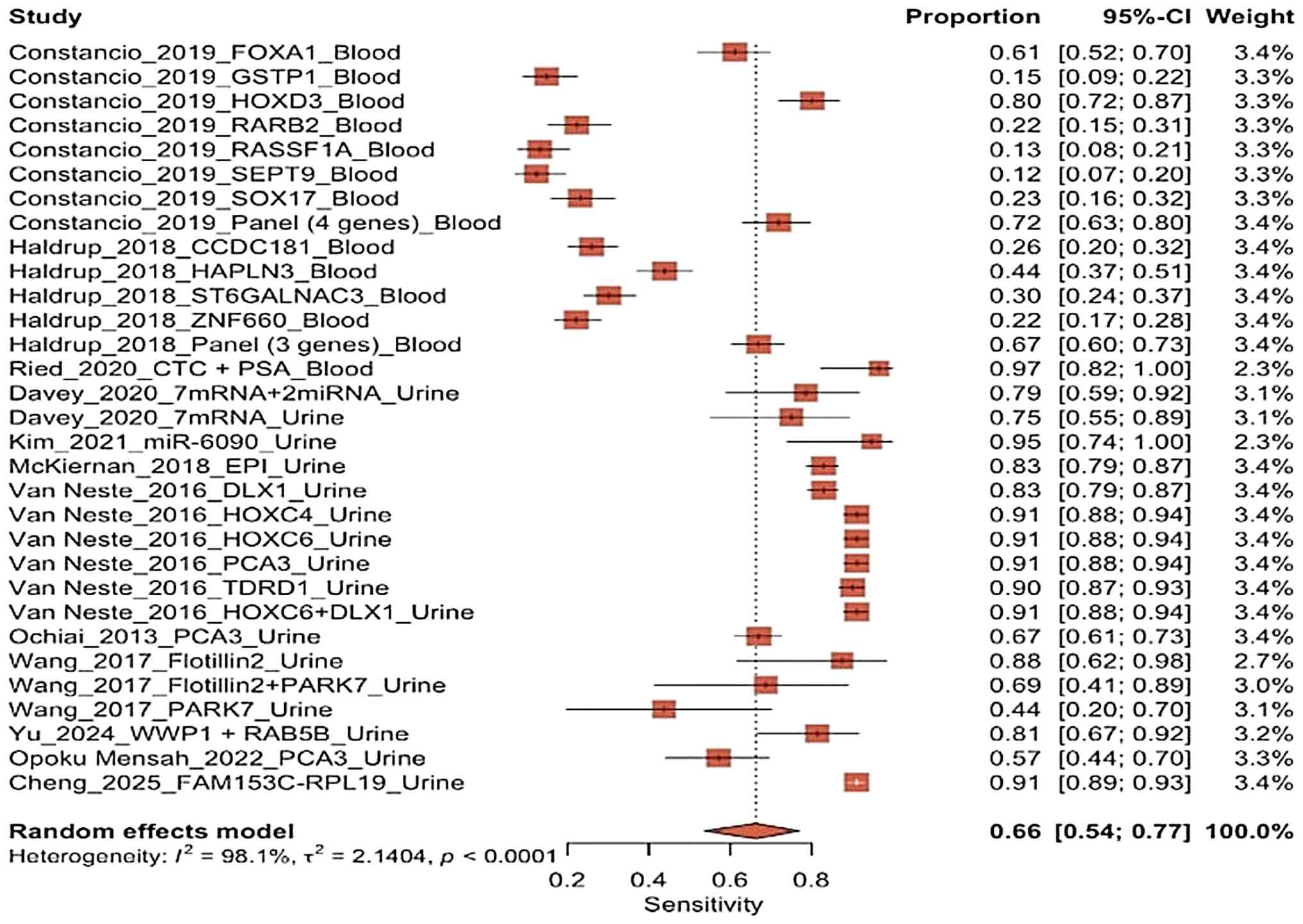 The forest plot of sensitivity of blood biopsy and urine biopsy using random model effect (Fig. 8) revealed significant variations in diagnostic performance between the studies. Generally, the blood-based studies exhibited lower and more widely dispersed sensitivity values (ranging from 0.12 to 0.80), particularly for single markers. By contrast, the urine-based studies exhibited relatively high and consistent sensitivity values (~0.67 to 0.97). This distinction is noticeable in the distribution of confidence intervals at the top of the graph, where several urine biomarkers, including HOXC6, HOXC4 and PCA3, and the multigene panel from the study Van Neste et al (18) cluster in areas indicating high sensitivity with relatively narrow confidence intervals. This suggests that these estimates are more stable. By contrast, the majority of blood-based biomarkers (such as RASSF1A, SEPT9, RARB2 and SOX17) exhibited a low to intermediate sensitivity with wider confidence intervals, reflecting greater variability in estimates and smaller sample sizes (13).