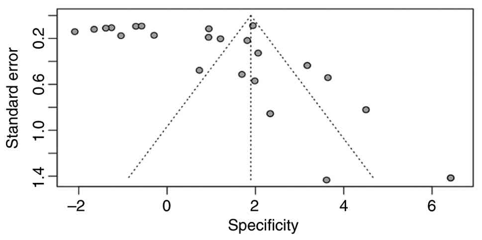 Egger's test was used for linear regression method in the meta-analysis to detect potentials publication bias by measuring the asymmetry of the funnel plot. The bias assessment for specificity funnel plot analysis of the present meta-analysis (Fig. 9) revealed a clear asymmetrical distribution of study points. Studies with a high specificity are clustered in the upper right-hand corner of the plot, while those with lower specificity are less common and unevenly distributed toward the left-hand corner. This imbalanced distribution correlates with the significant result from Egger's test (t=2.60; P=0.014), which indicates funnel plot asymmetry and suggests the possibility of bias in specificity estimates.