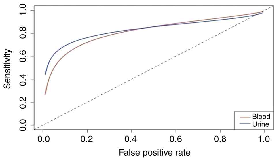 The characteristics of 12 studies included in the present meta-analysis are depicted in Table II. There were three studies based on blood biopsies (13-15) and nine studies based on urine biopsies (16-24). Some studies reported more than one biomarker within the same study, leading to variations in gene targets, laboratory platforms, and sample sizes of both cases and non-cases. Blood biopsy biomarkers demonstrated a very high specificity, but exhibited a low to moderate sensitivity. By contrast, urine biomarkers exhibited higher and more consistent sensitivity, although with significant variations in specificity.