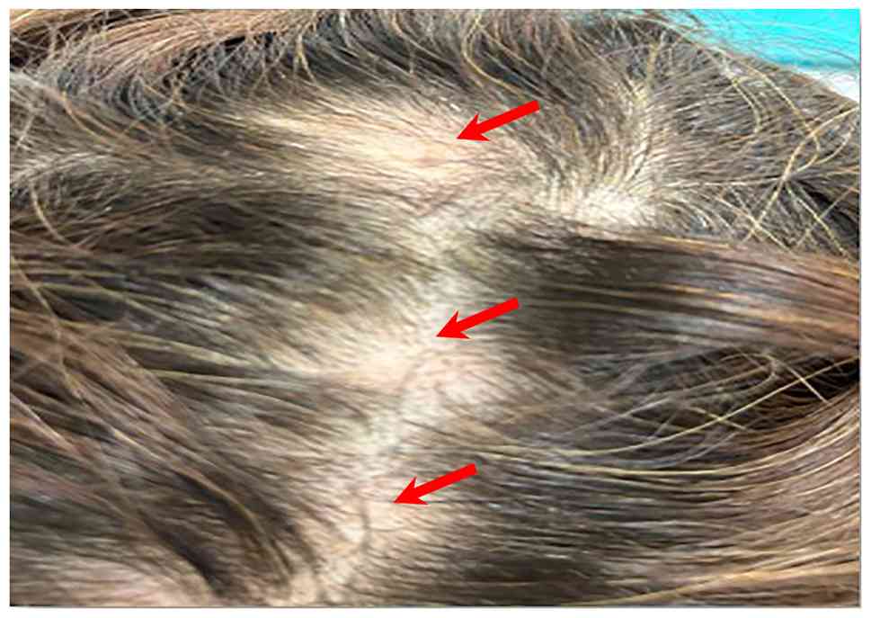 Upon a clinical examination, irregular patches of hair thinning, each a few centimeters in size, were observed on an erythematous base, accompanied by slight swelling but no palpable mass (Fig. 1). There was no lymphadenopathy or similar lesions elsewhere on the body.