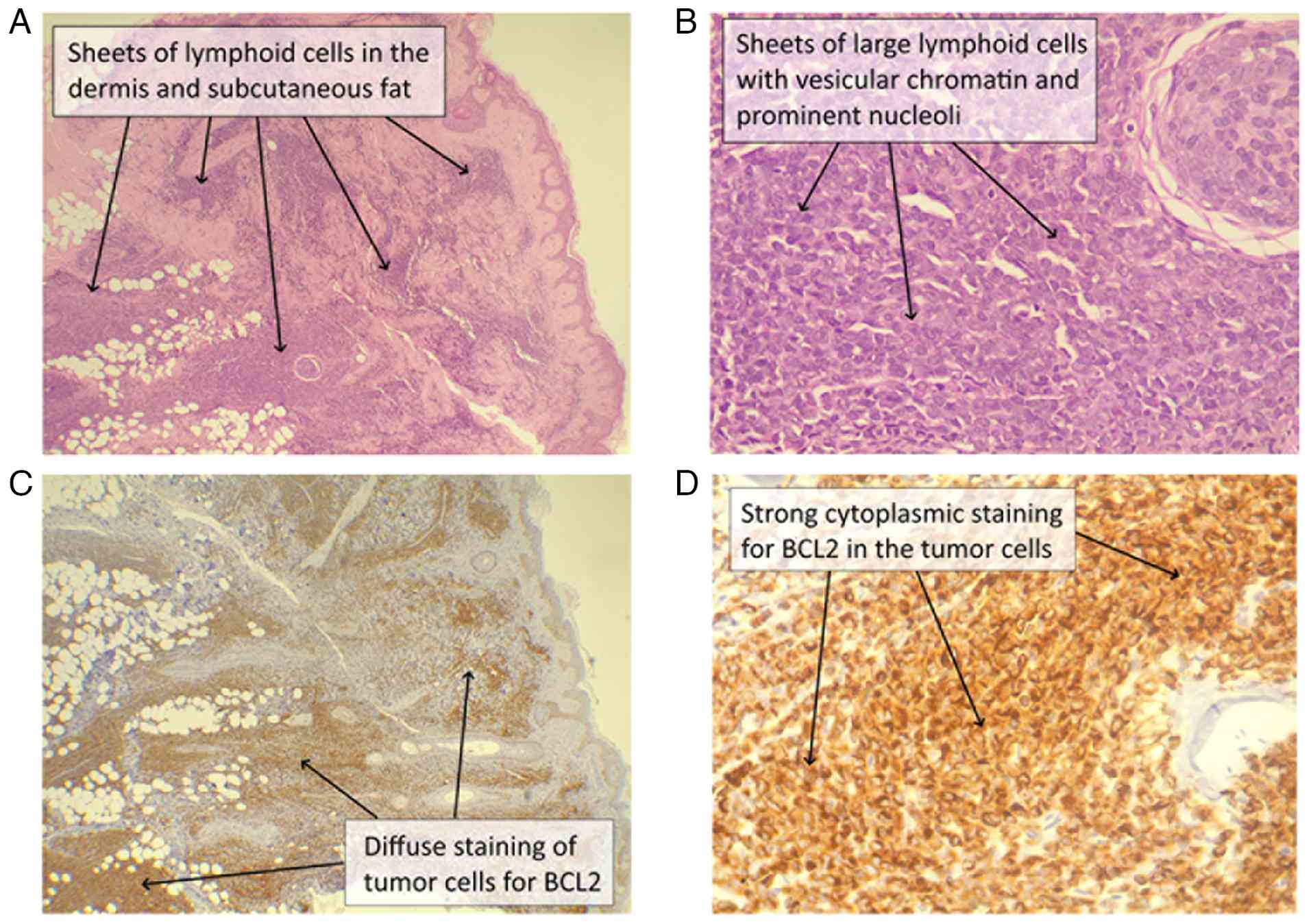PCDLBCL-LT is rare and aggressive, marked by the abnormal growth of B-cells in the skin (4). This condition typically involves the dermis and subcutaneous layers, resulting in rapidly growing, red to blueish nodular tumors, usually on the lower limbs. However, it can also occur in other parts of the body. PCDLBCL-LT accounts for 4% of all newly diagnosed PCLs annually. It primarily affects older women and is associated with a worse prognosis (4).