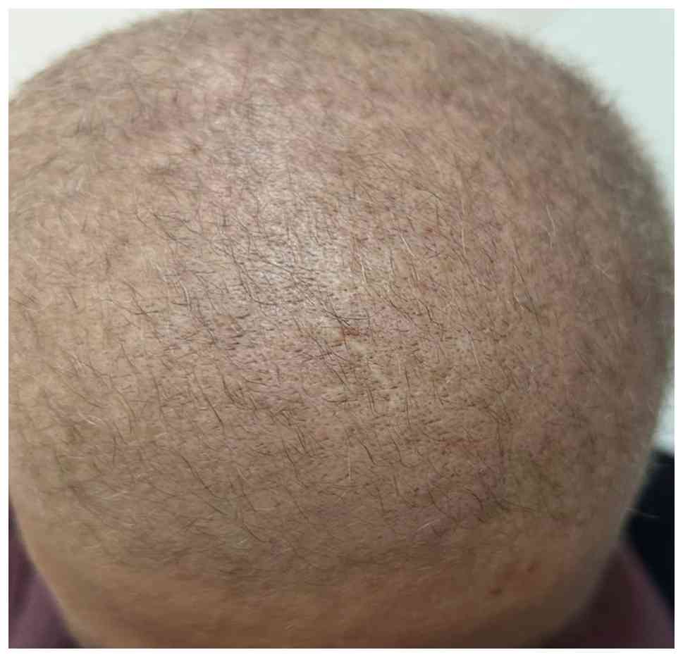 A 45-year-old female patient presented to Smart Health Tower (Sulaymaniyah, Iraq) in January, 2025 with localized hair loss on the scalp lasting for 4 months, accompanied by mild redness and itching. No notable systemic symptoms were reported.