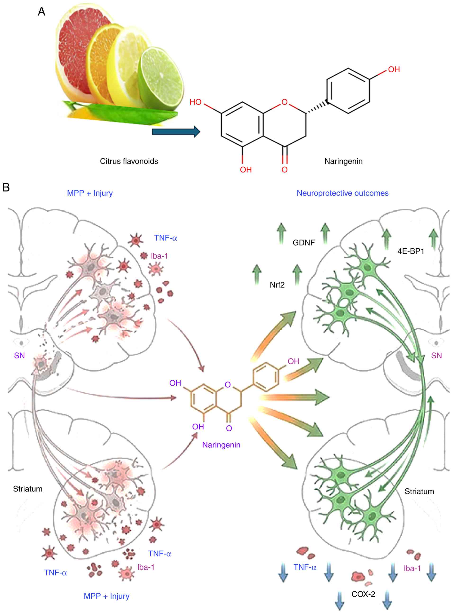 Naringenin may aid in the recovery of dopaminergic neurons following injury if it is administered shortly after the damage has occurred. Dopaminergic neurons are preserved, and glial cell line-derived neurotrophic factor (GDNF) is restored in the substantia nigra (SN), and the number of neurons immune reactive for calcium-binding adaptor molecule 1 (Iba-1) and necrosis factor α (TNF-α) are also resorted (21). In the striatum was reduced as indicators of inflammation in the brain after pre-treatment with naringenin in rats with unilateral 1-methyl-4-phenylpyridinium (MPP+) injury. Eukaryotic initiation factor 4E-binding protein 1 (4E-BP1), and growth differentiation factor and GDNF were upregulated in the cerebellum following a single injection of naringin. Naringin then decreases TNF-α and cyclooxygenase-2 (COX-2) levels and raises the transcription factor nuclear factor 2 (Nrf2) (20).