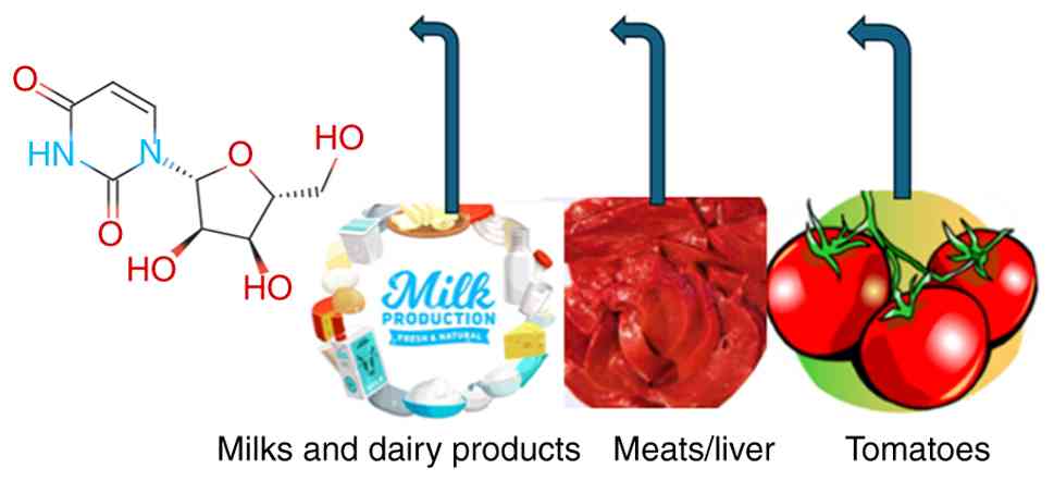 Several foods contain uridine in the form of RNA (36). Although it is claimed that virtually none of the uridine in this form is bioavailable, as demonstrated by Gasser et al (36) in 1981, it is destroyed in the liver and gastrointestinal tract, and no food, when consumed, has ever been reliably shown to elevate blood uridine levels. A previous study found that plasma uridine levels increased 1.8-fold at 30 min following the consumption of beer, indicating at the very least inconsistent evidence (37). On the other hand, ethanol which is found in beer raises uridine levels, which may explain the increased Uridine plasma concentration rises due to pyrimidine breakdown after purine degradation by ethanol and fructose (38).