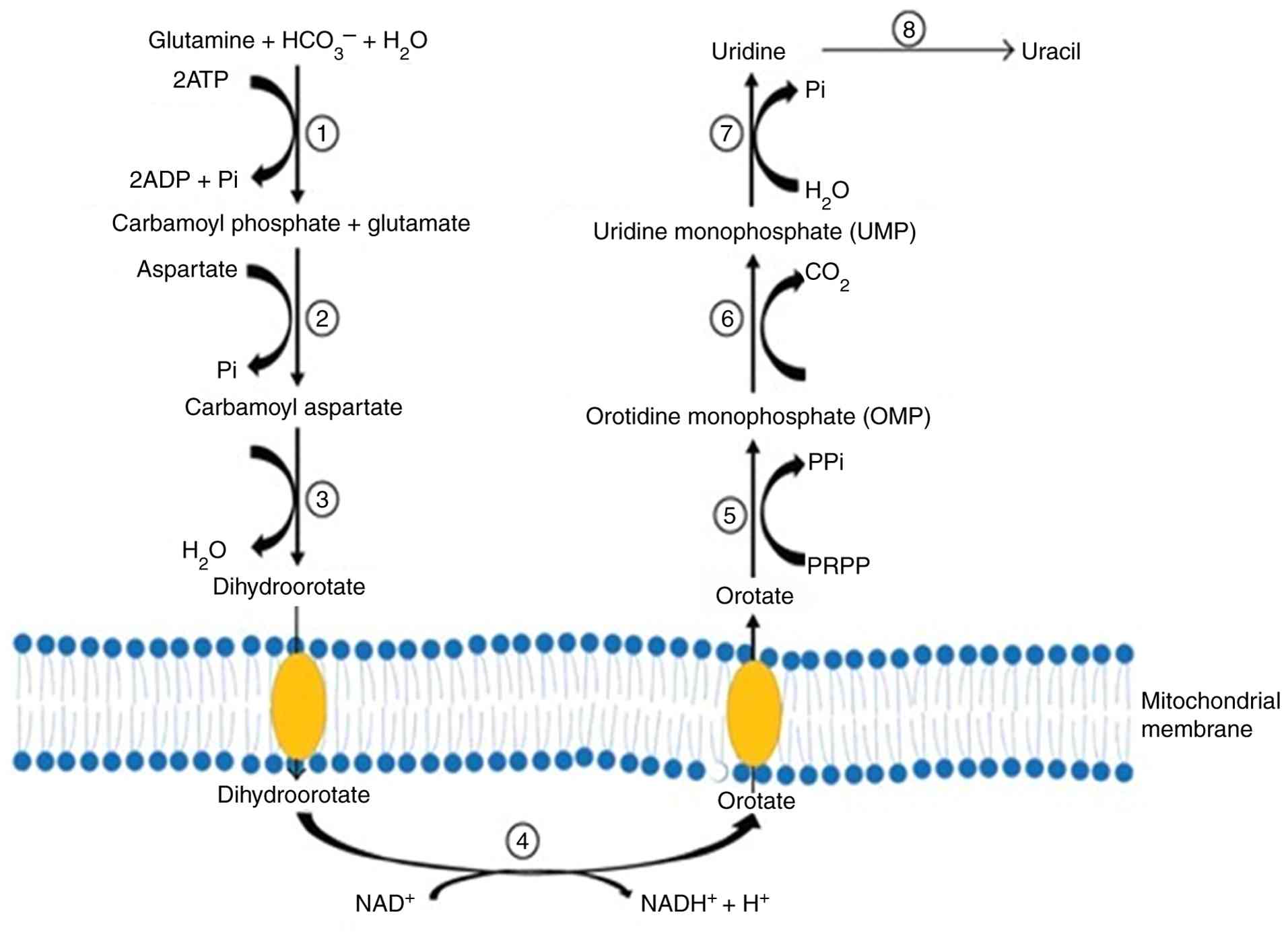 Zhang Y, Guo S, Xie C and Fang J: Uridine metabolism and its role in glucose, lipid, and amino acid homeostasis. Biomed Res Int. 2020(7091718)2020.PubMed/NCBI View Article : Google Scholar | |