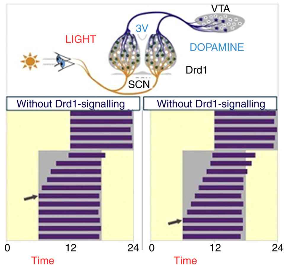 Grippo RM, Purohit AM, Zhang Q, Zweifel LS and Güler AD: Direct midbrain dopamine input to the suprachiasmatic nucleus accelerates circadian entrainment. Curr Biol. 27:2465–2475.e3. 2017.PubMed/NCBI View Article : Google Scholar | |