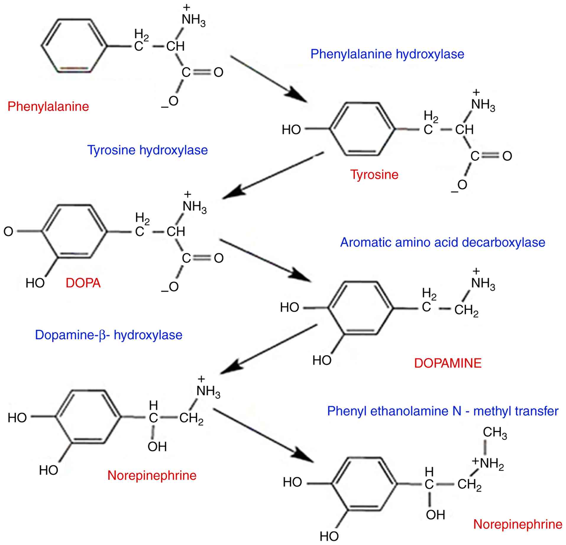 The enzyme TH catalyzes the first step, which is hydroxylation to DOPA. Aromatic L-amino acid decarboxylase rapidly converts DOPA to dopamine after it is produced. In neurons that employ dopamine as a transmitter, enzymatic alteration stops there. An extra enzyme called dopamine-by-hydroxylase is present in neurons that employ norepinephrine as a transmitter, and it transforms dopamine into norepinephrine. Phenylethanolamine N-methyltransferase is an extra enzyme found in neurons that use epinephrine as a transmitter. It catalyzes the conversion of norepinephrine to epinephrine. Tyr hydroxylation, the first step in the route, is rate limiting, which means that it regulates the rate of synthesis throughout the whole pathway (61,62). Initial research has revealed that the enzyme is susceptible to end-product inhibition (63).