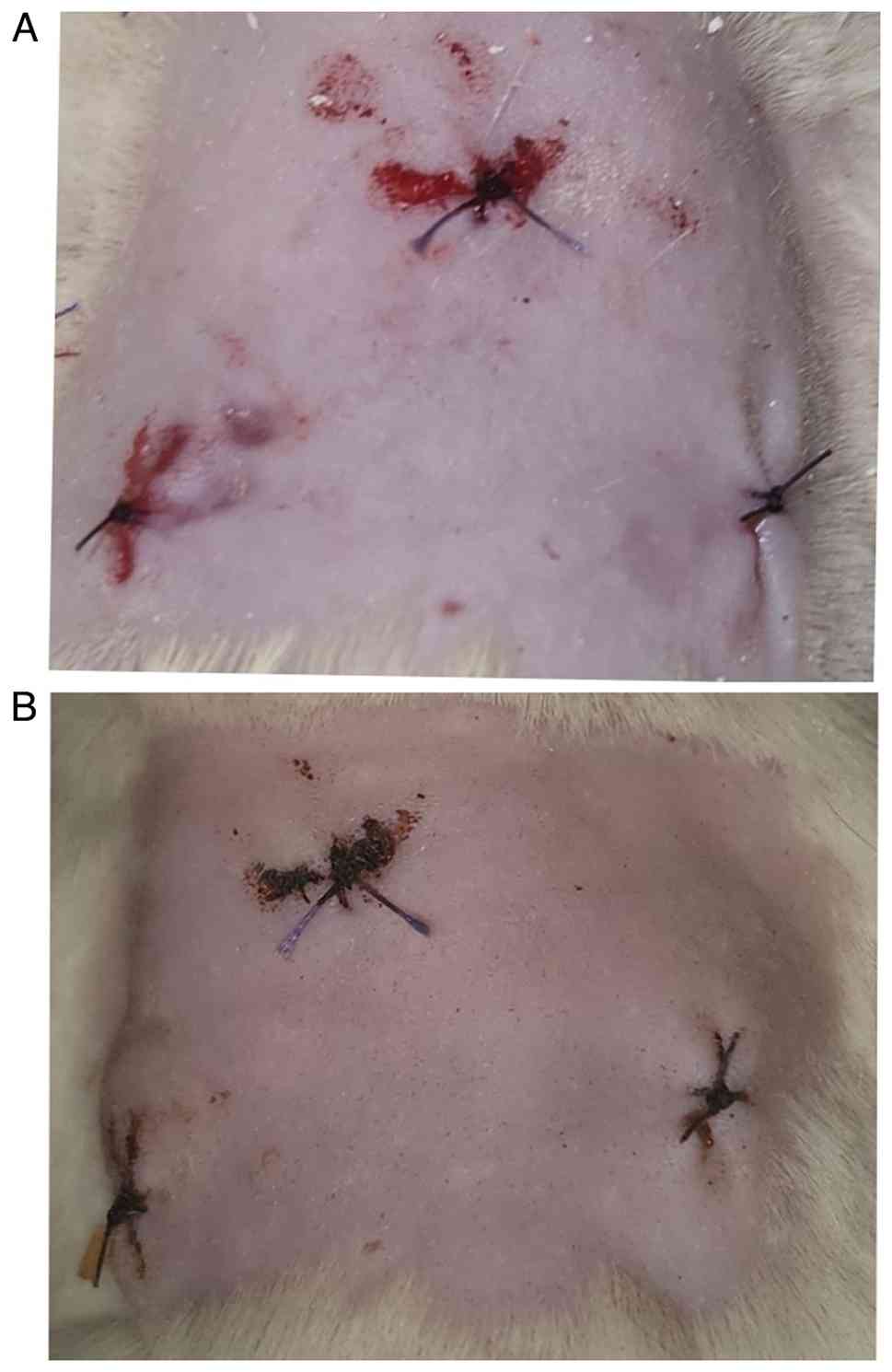 In the present study, at 1 week post-implantation, no adverse skin reactions (Fig. 1B) were noted at all three sites. At 2 weeks, the initial phagocytic activities of the cell were noted, followed by the degradation process and subsequent reabsorption of the material. In the implantation area, the particles were surrounded by collagen fibres, with mild inflammatory infiltrate. A sparse number of multinucleated cells and large blood vessels were also observed. The minimum number of inflammatory cells was noted at all three sites.