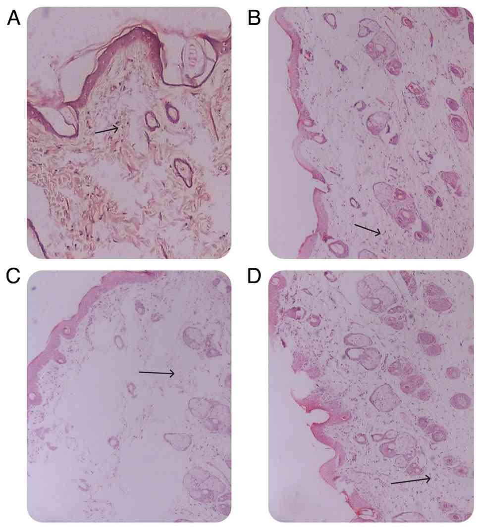 The cell viability assays were performed in triplicate and the data are presented as the mean and standard deviation. The statistical analysis was performed using Statistical Package for the Social Sciences 18.0 (SPSS, Inc.) The Kruskal-Wallis test was used to compare the mean inflammatory scores between the groups followed by Dunn's multiple comparison test. A P-value <0.05 was considered to indicate a statistically significant difference. Spearman's rank correlation analysis was used to assess difference between the inflammatory scores within the same animal.