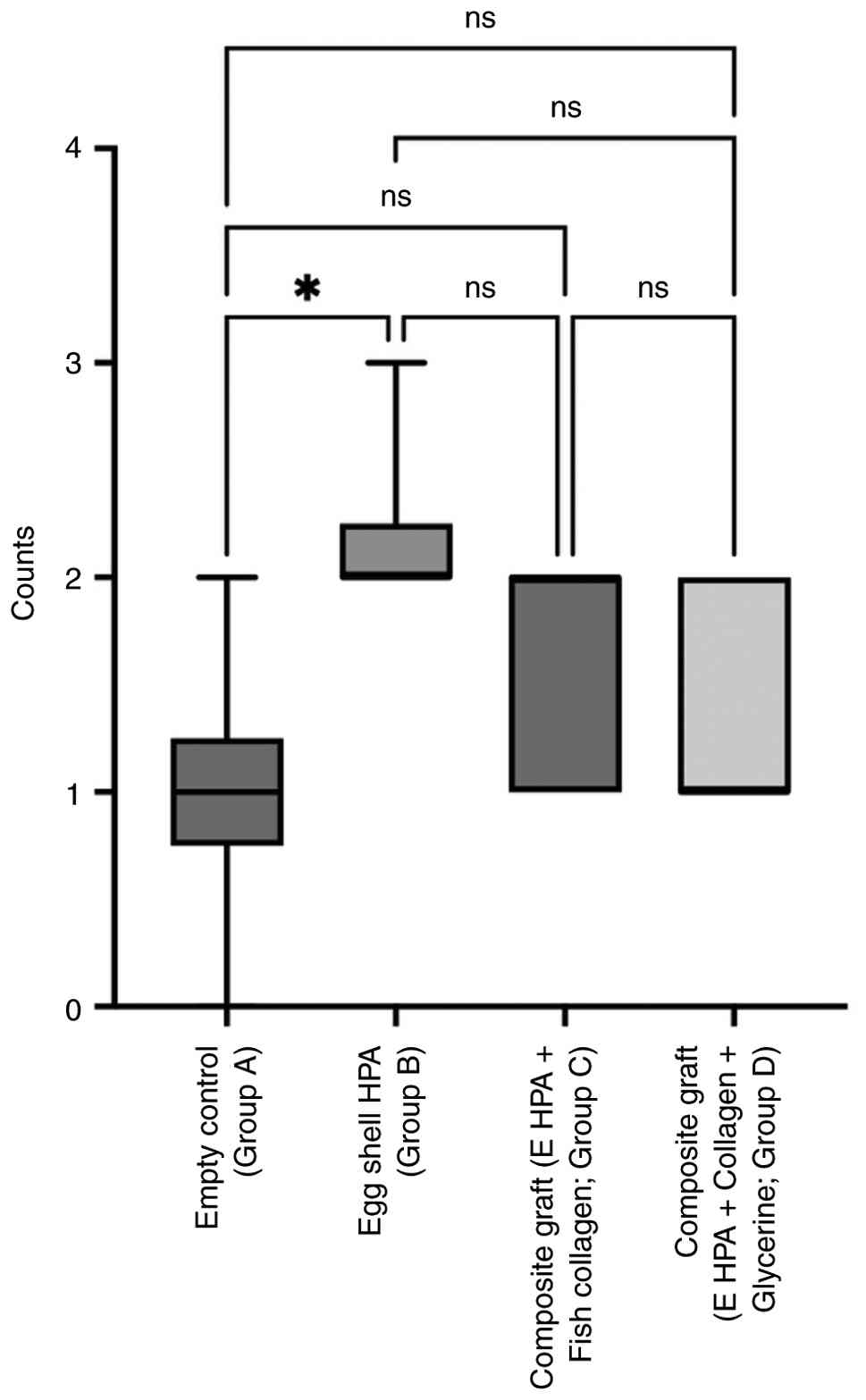 Ma et al (24) reported that eggshell-derived amorphous calcium phosphate (ACP) particles displayed better biocompatibility than ACP synthesised from synthetic hydroxyapatite in three-dimensional osteoblastic spheroids. Another study on the effects of eggshell granulate and calcium carbonate on bovine osteoblasts revealed that additives (eggshell-derived calcium carbonate) increased osteoblast activity. The cell cultures treated with eggshells displayed the most potent effects, whereas for hyaluronan, a weaker cell activity was detected (25).