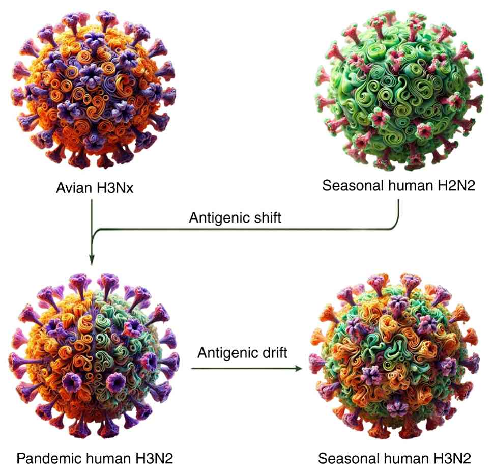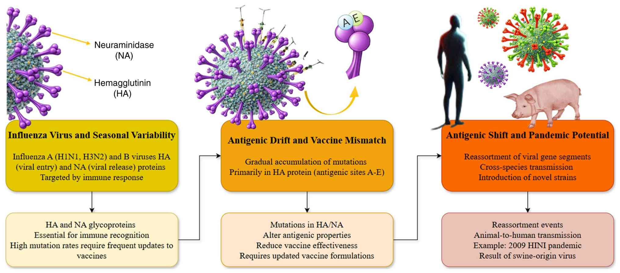 Influenza virus evolution is primarily driven by two mechanisms: Antigenic drift and antigenic shift. These processes result in continuous alterations of viral surface proteins, frequently leading to vaccine mismatch when circulating strains differ from those selected for vaccine production (9). Such mismatches reduce vaccine effectiveness because viral evolution remains unpredictable while vaccine production timelines are fixed. Consequently, robust global surveillance and regular updates to vaccine formulations are essential to mitigate this challenge. As illustrated in Fig. 1, influenza viruses evolve through gradual mutations (antigenic drift) and major genetic reassortment events (antigenic shift). These mechanisms necessitate frequent vaccine reformulation and, in some cases, facilitate zoonotic transmission events that increase pandemic risk (9).
