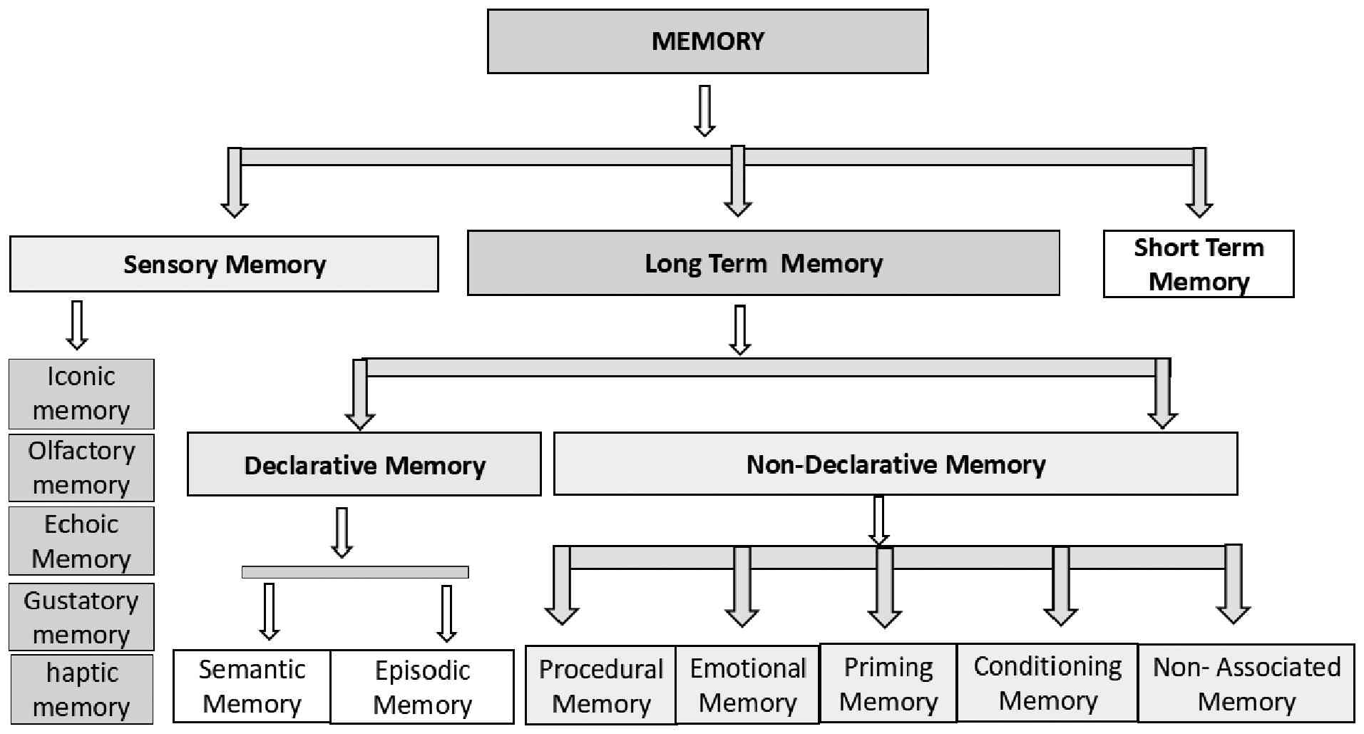 Memory can be classified as sensory memory, short-term memory or working memory, and long-term memory according to the multistore (or modal) model proposed by Atkinson and Shiffrin in 1968(31). As regards sensory memory, in cognitive psychology, sensory memory is defined as the primary stage of the memory process. It functions as a modality-specific buffer that preserves a high-fidelity, isomorphic (unprocessed) representation of environmental stimuli. It essentially acts as a highly detailed, fleeting snapshot of the environment that allows the brain a fraction of a second to process incoming sensations before they are lost or moved to short-term memory (32). Its range may from milliseconds to 4 sec. Sensory memory can be classified as iconic memory (vision). echoic memory (sound), haptic memory (touch), olfactory memory (smell) and gustatory memory (taste). Short-term memory and long-term memory are discussed in more detail in the sections below.