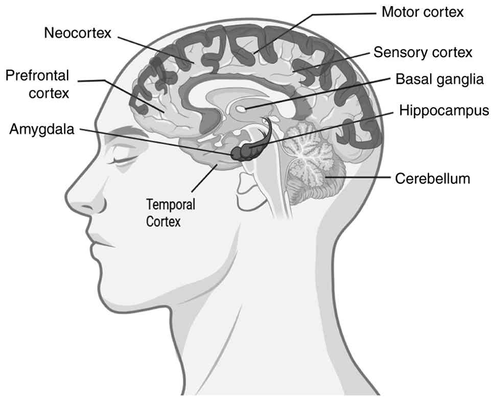 Certain regions of the brain encode different types of memories. The hippocampus is the most critical region of the brain responsible for declarative memories, semantic facts and events remembrance is coded by the hippocampus (39). The basal ganglia are responsible for spatial navigation memory (direction). Procedural learning, including motor skills, is associated with the basal ganglia, such as cycling, driving and learning a new language (40). The limbic system, including the amygdala encodes emotional memories, such as weddings, birthdays, winning an award ceremony and old school days. Laughing, crying and weeping are associated with the limbic system and are encoded by the amygdala (41). Short-term memory is encoded by the cortex region, the prefrontal cortex, the neocortex, sensory and motor cortex. Short-term memories are often termed working memories (33,34). The various parts of the brain responsible for different types of memories are depicted in Fig. 2.