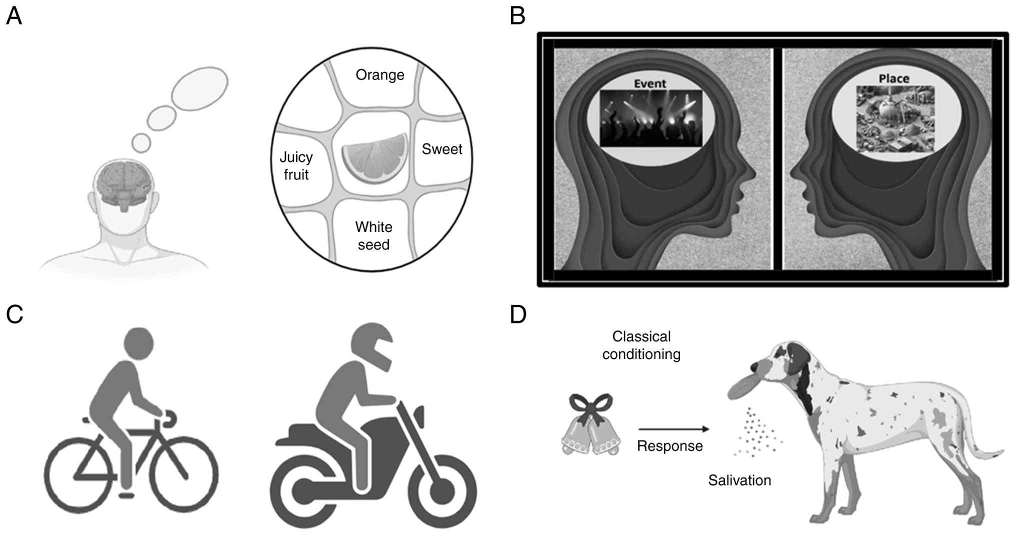Episodic memory represents all the previous events of the life of an individual that occurred at a particular place and specific time. These types of memories are often associated with an individual emotion. For instance, remembering the first day of school, a memorable vacation, or a significant life event, such as winning a championship in any game or in event are to be included in episodic memories, and these memories and moments from life can be recalled (76,77). A previous study revealed that a specific circuit, comprising the medial prefrontal cortex, lateral entorhinal cortex and hippocampus, encodes episodic-like memories by integrating event, place and time information (78). This process appears to involve top-down regulation from the medial prefrontal cortex to the hippocampus. This circuit is distinct from those processing individual components of memory (object, time and place).