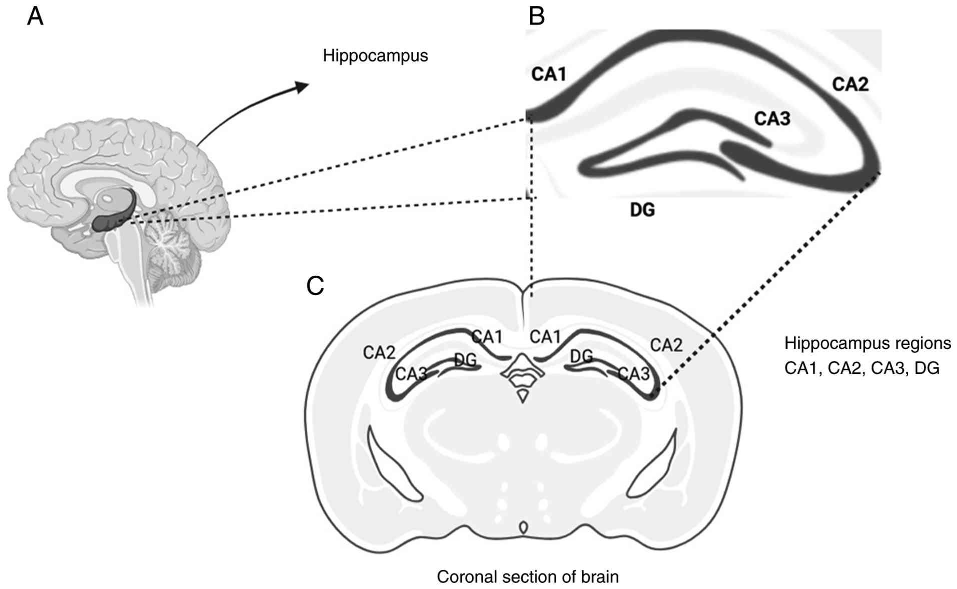 Conceptual complexity arises in ongoing debate regarding how specific subfields within the hippocampus contribute to these functions. It is important to know that the dentate gyrus (DG), CA3, and CA1 are three primary regions of the hippocampus that exhibit distinct properties. Specifically, the DG is unique among them for its ability to generate new neurons throughout adulthood, a process known as adult neurogenesis (156). The DG, CA3 and CA1 region in the hippocampus is illustrated in Fig. 5.