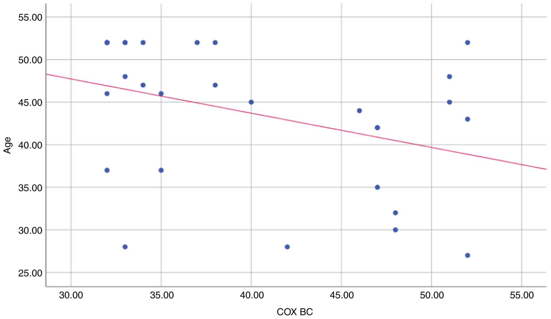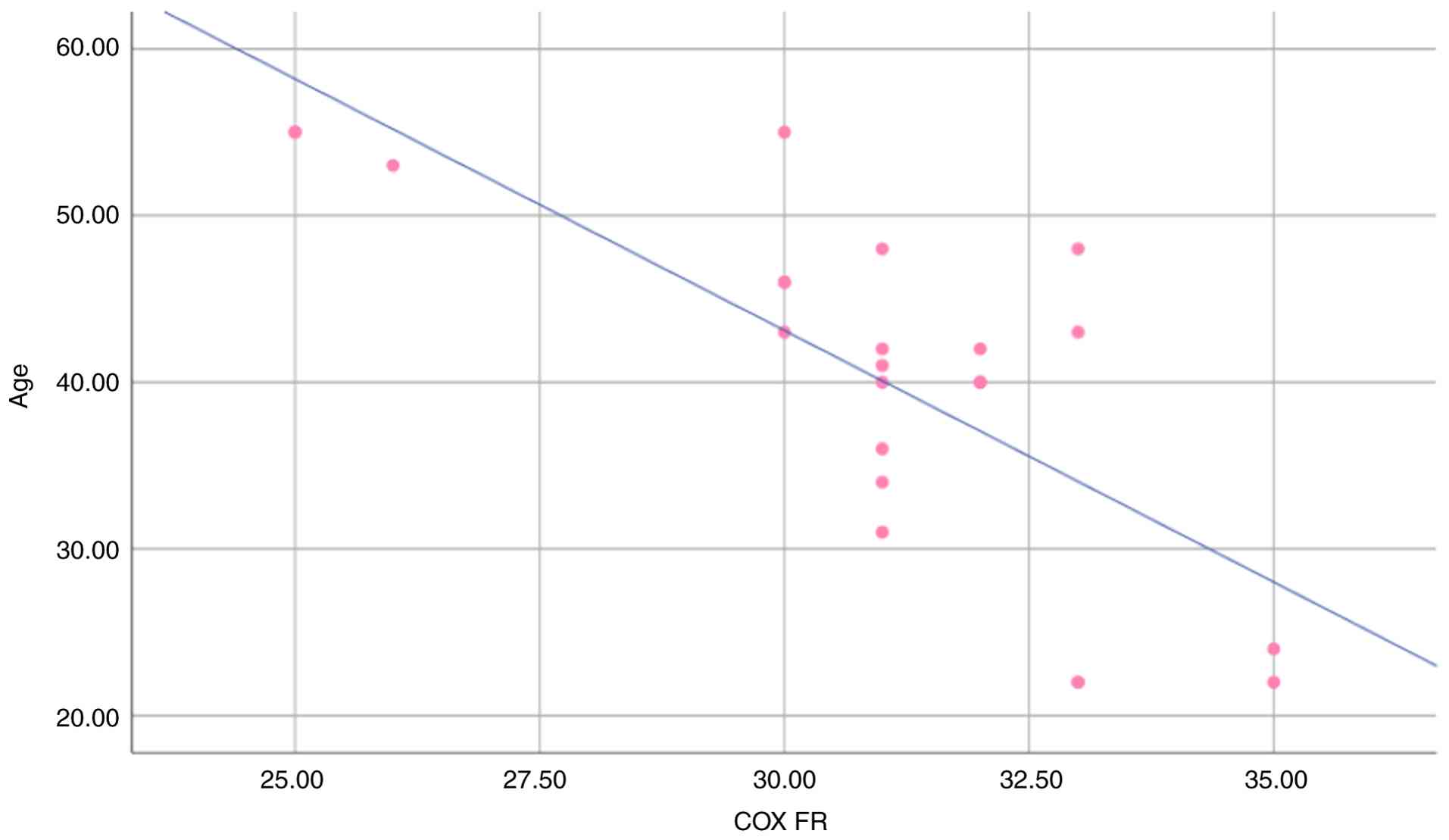 Pearson's correlation analysis (Table IV) provided valuable insight into the correlations between multiple variables in the context of sera in all the study groups. According to the results presented in Table IV and Fig. 1, age and serum COX-2 in the breast cancer group exhibited a significant negative correlation (r=-0.368, P=0.049). Furthermore, there was no correlation observed between other parameters. In first-degree relatives group, there was a strong negative correlation between age and serum COX-2 (r=-0.755, P=0.001), as demonstrated in Table IV and Fig. 2. In the control group, there was no correlation among all parameters.