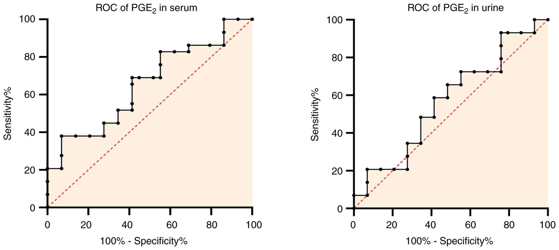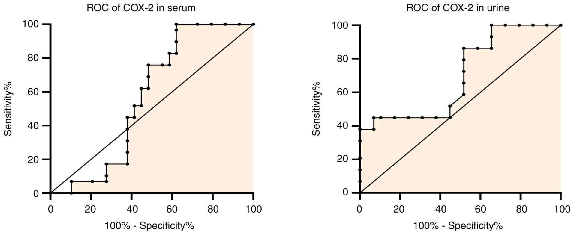 With the use of enzyme-linked immunosorbent assay (ELISA), the serum and urinary COX-2 concentrations were measured using the Human PTGS2/COX-2 ELISA kit [cat. no. ELK2096, Elk (Wuhan) Biotechnology Co., Ltd.]. The assay has a reported lower limit of detection of 0.125 ng/ml and a detection range of 0.32-20 ng/ml. The manufacturer states that the coefficients of variation within and between assays are <8 and 10%, respectively. The PGE2 levels were quantified using the Human PGE2 ELISA kit [cat. no. ELK9315, Elk (Wuhan) Biotechnology Co., Ltd.]. This competitive ELISA has a reported sensitivity of 0.97 pg/ml and a detection range of 3.13-200 pg/ml, with high specificity and minimal cross-reactivity. At a wave-length of 450 nm, the optical density (OD) was determined on a 96-well microplate reader and the COX-2 and PGE2 concentrations are expressed in pg/ml. Urine creatinine concentrations were measured by colorimetric assay using the automatic Roche/Hitachi cobas c111 System and the concentrations are expressed in mg/dl. The COX-2 and PGE2 concentrations in urine were divided by the level of creatinine in urine for the purpose of providing a representative sample, enabling us to analyzed these parameters without the need for collecting urine for 24 h.