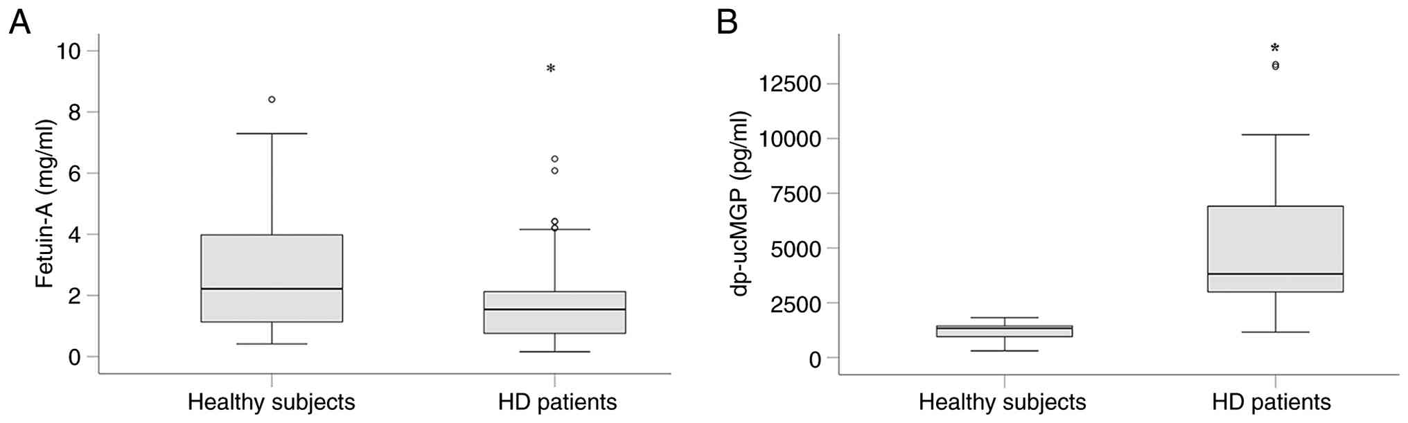 Serum fetuin-A and dp-ucMGP levels in patients undergoing HD and healthy volunteers. Serum fetuin-A levels were significantly lower in patients undergoing HD than in healthy volunteers [1.54 (0.76-2.13) vs. 2.22 (1.423-3.980) mg/ml, respectively; P=0.02, Mann-Whitney U test] (Fig. 1A).