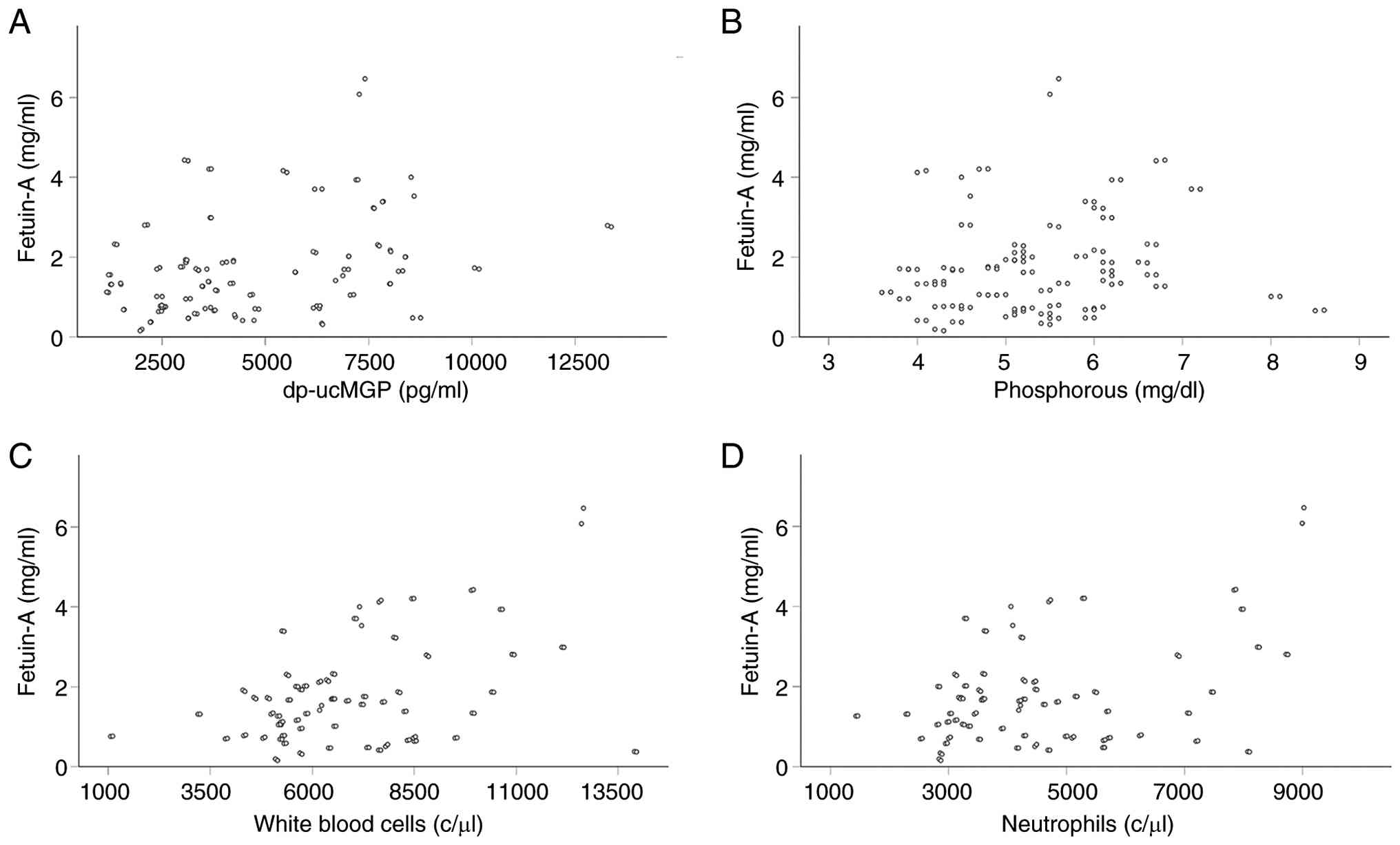 Notably, among the factors depicted in Table I, serum fetuin-A levels exhibited positive correlations with serum dp-ucMGP levels (Rho=0.311, P<0.001) (Fig. 3A), and phosphorus (Rho=0.184, P=0.042) (Fig. 3B). No correlations were detected between fetuin-A and the nutritional markers, body mass index (BMI; Rho=0.072, P=0.426) and serum albumin (Rho=-0.001, P=0.992) (data not shown). Fetuin-A was also not correlated with the urea reduction ratio (Rho=0.082, P=0.364) (data not shown). Although a positive correlation was detected with the white blood cell count (Rho=0.280, P=0.002) (Fig. 3C) and neutrophils (Rho=0.226, P=0.012) (Fig. 3D), no correlation was detected with serum C-reactive protein (CRP; Rho=0.037, P=0.680) (data not shown). In addition, using a serum CRP cut-off of 1 mg/dl to detect inflammation did not reveal that inflammation affects serum fetuin-A levels. Its levels were 1.62 (0.78-2.02) mg/ml in those with a CRP level <1 mg/ml, and 1.39 (0.75-2.28) mg/ml in those with a CRP level >1mg/dl (P=0.658, Mann-Whitney U test) (Table II).