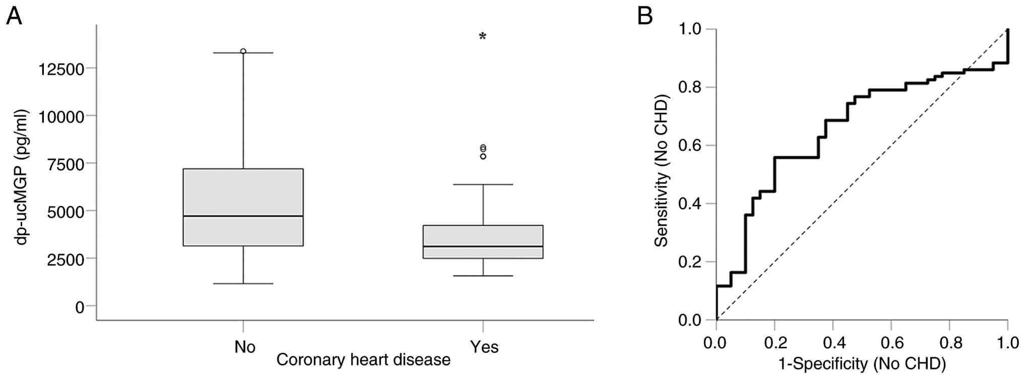 As in previous studies (15,16), serum dp-ucMGP levels were higher in patients undergoing HD than in healthy volunteers. In the present study, in patients undergoing HD, dp-ucMGP levels were significantly lower in those with established CHD than in those without CHD. ROC curve analysis revealed an AUC of 0.659 for identifying CHD-free patients, indicating serum dp-ucMGP as a moderately significant marker of CHD in patients undergoing HD.