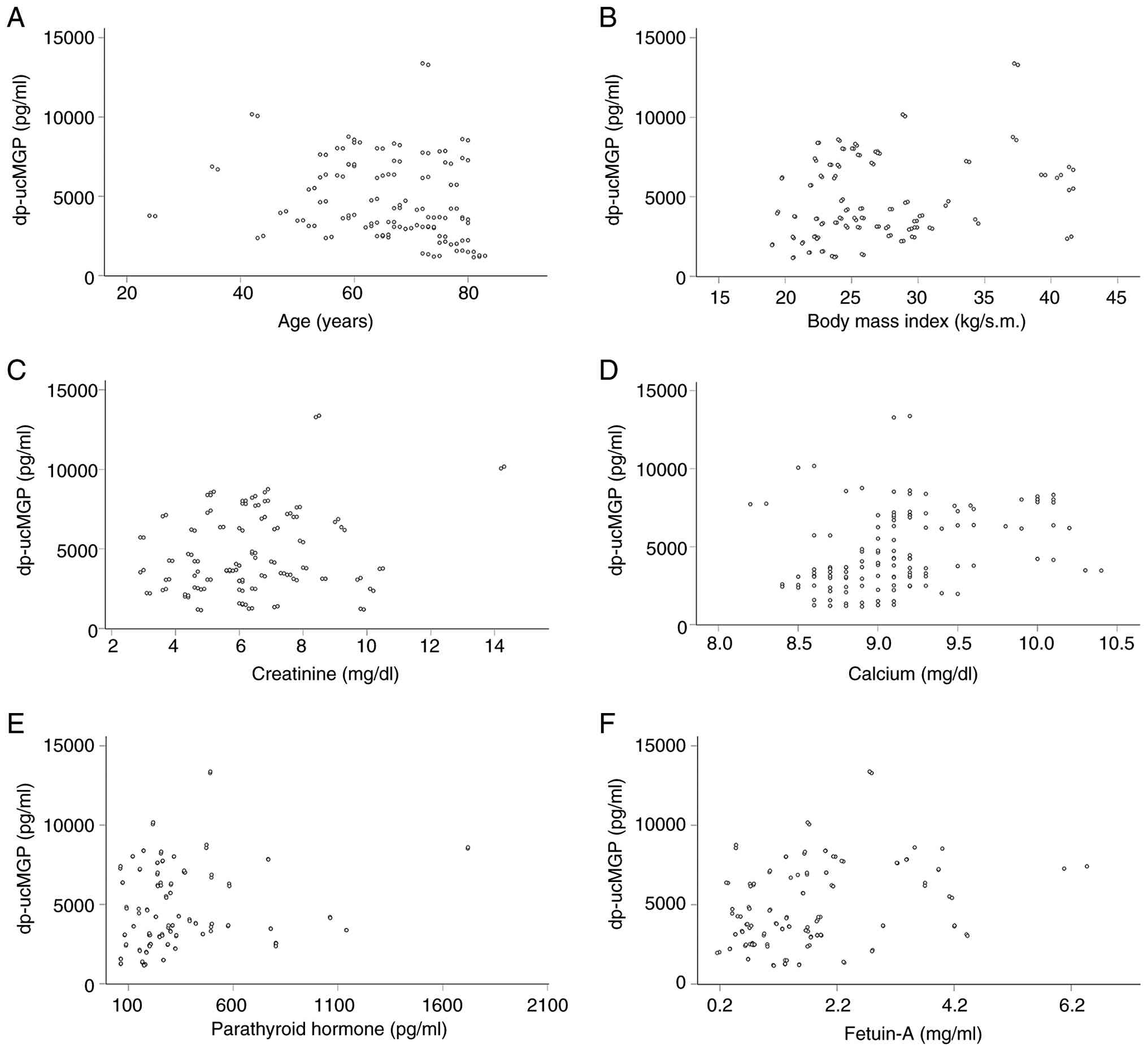 From the factors depicted in Table I, serum dp-ucMGP levels were correlated negatively with age (Rho=-0.302, P<0.001) (Fig. 5A), and positively with BMI (Rho=0.230, P=0.010) (Fig. 5B), creatinine (Rho-0.187, P=0.037) (Fig. 5C), calcium (Rho=0.398, P<0.001) (Fig. 5D), intact parathyroid hormone (iPTH; Rho=0.192, P=0.031) (Fig. 5E) and fetuin-A (Rho=0.311, P<0.001) (Fig. 5F). Notably, dp-ucMGP was not correlated with serum albumin (Rho=0.139, P=0.121) or the urea reduction ratio (Rho=-0.074, P=0.409) (data not shown). Although no correlation was detected with CRP (Rho=-0.153, P=0.087), when a CRP cut-off point of 1 mg/dl was set for defining inflammation, those with inflammation had lower dp-ucMGP levels [3,631.09 (2,492.57-6,218.71) pg/ml] than those without inflammation [4,684.97 (3,181.79-7,197.20) pg/ml] (P=0.032, Mann-Whitney U test) (Table III).