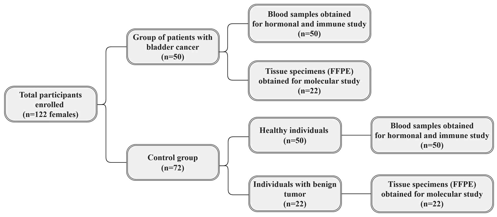 The present case-control study involved 122 participants, all of whom were women of different ages ranging from 35-80 years, with a median age of 64 years. Among the participants, 50 patients who were diagnosed with bladder cancer (Table I) provided blood samples for hormonal analysis, of whom 22 also contributed tissue specimens [as formalin-fixed, paraffin-embedded (FFPE) blocks] for molecular studies. The control group included 72 age-matched individuals of whom 50 provided blood samples for hormonal comparison with the patient group, whereas the remaining 22 had benign tumors that were histologically diagnosed as benign urothelial papilloma and endometriosis of the urinary bladder. These diagnoses were confirmed by histopathological examination, with no evidence of malignancy or dysplasia. FFPE tissue specimens were collected from these cases and used as a comparison group for the bladder cancer tissue data (Fig. 1). For both the patient and control groups, venous blood samples were obtained and immediately processed by centrifugation at 3,000 x g for 10 min at room temperature (20-25˚C) to separate the serum, which was then aliquoted and stored in a deep freeze until further analysis. The present study was performed in compliance with the Declaration of Helsinki and approved by the Institutional Review Committee of College of Science, in cooperation with the Local Ethics Committee of the Biology Department, Mustansiriyah University (Baghdad, Iraq; January 2024; approval. no. BCSMU/1024/0062Z).