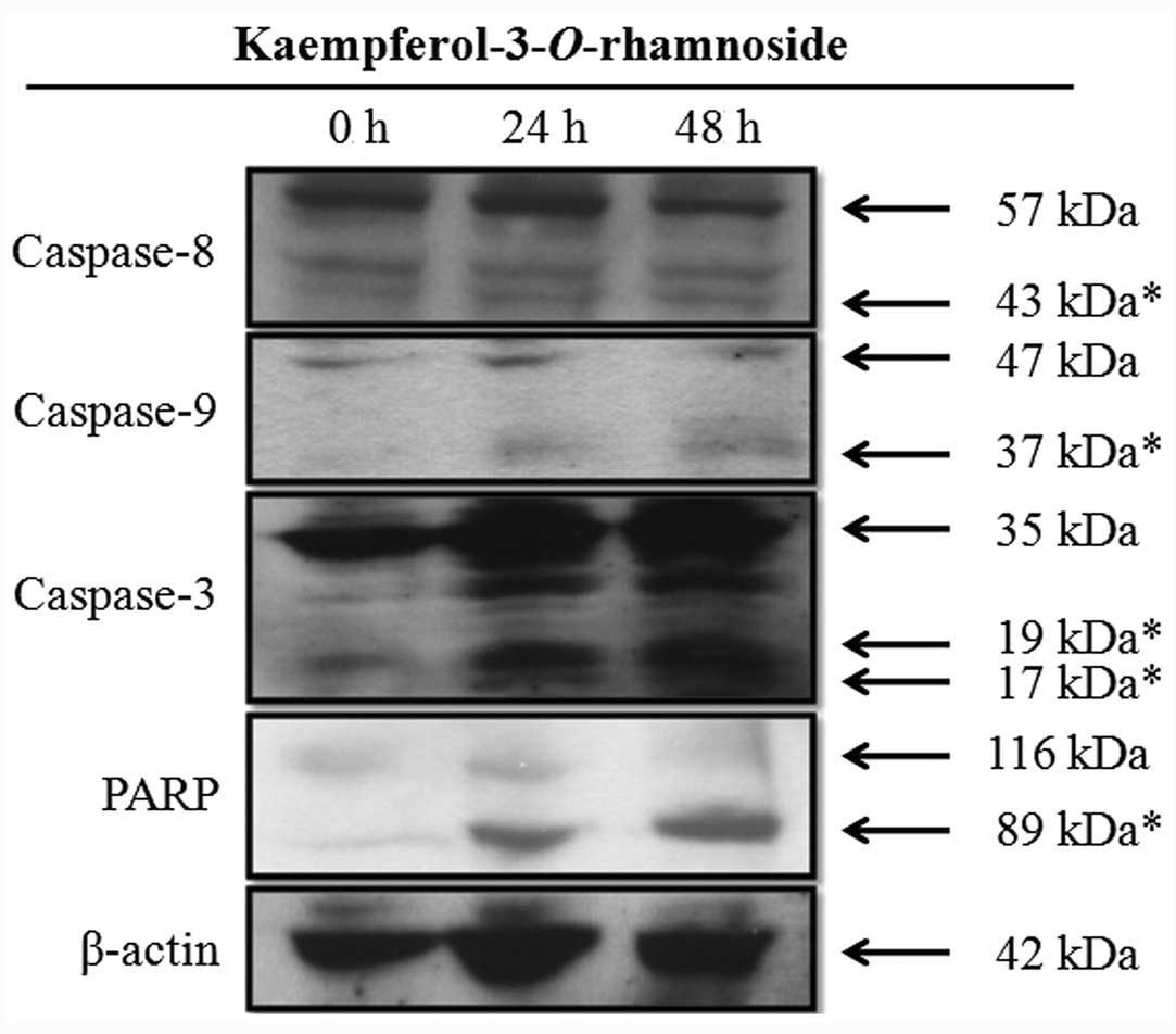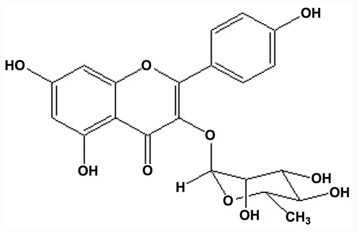 Our previous study also reported the anticancer properties of kaempferol-3-O-rhamnoside on MCF-7 human breast cancer cell lines. The results indicated that kaempferol-3-O-rhamnoside inhibits the proliferation of MCF-7 cells through the activation of caspase-9 and caspase-3 proteins and that it induced apoptosis (4).