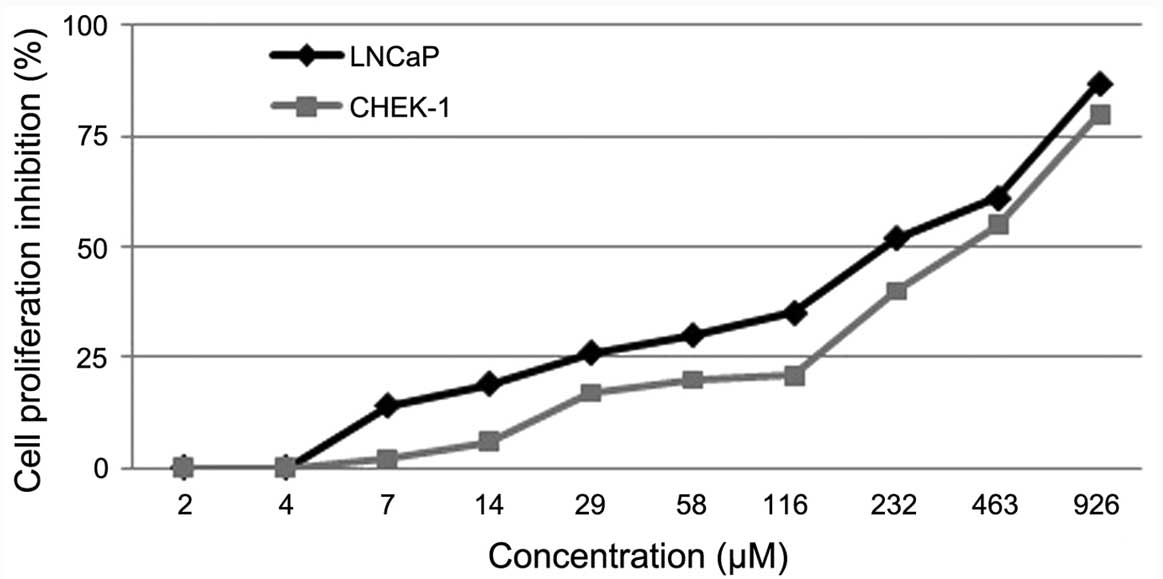 The effect of kaempferol-3-O-rhamnoside on the viability of LNCaP and CHEK-1 cells was evaluated. The result of the MTT assay indicated that the treatment of cancer (LNCaP) and non-cancer (CHEK-1) cell lines with kaempferol-3-O-rhamnoside resulted in dose-dependent inhibition of cell growth (Fig. 2). Twenty-four hours of treatment with kaempferol-3-O-rhamnoside inhibited the proliferation of the LNCaP cells with a half maximal inhibitory concentration (IC50) value of 218 µM. However, the inhibition of the CHEK-1 cell proliferation with kaempferol-3-O-rhamnoside demonstrated an IC50 of 386 µM, which was higher than that of the LNCaP cells. This may indicate that kaempferol-3-O-rhamnoside has fewer cytotoxic effects on the non-cancerous cells.