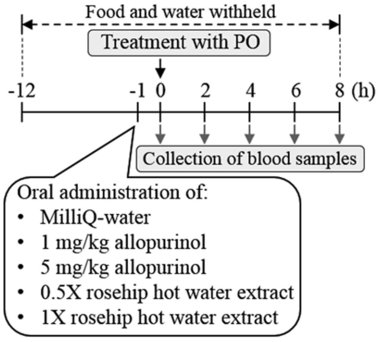 Treatment of hyperuricemia model mice with rosehip hot water extracts and allopurinol PO, a uricase inhibitor, was used to establish the hyperuricemia model mice, as described previously (30–33). Briefly, pellet chow and water supplies to the ddY mice (age, 6 weeks; body weight, 31.0±0.37 g) were halted the night before the experiment. The mice were randomly divided into five groups (n=7 in the control group; n=5 in the 5 mg/ml allopurinol group; and n=6 in the 1 mg/ml allopurinol, 0.5X or 1X rosehip hot water extract groups. The mice were treated with PO in 0.5% CMC-Na (280 mg/kg, i.p.) 1 h before oral administration of 5 ml/kg MilliQ-water (as the control group), 1 or 5 mg/kg allopurinol, or 5 ml/kg of 0.5X or 1X rosehip hot water extract (~82.5 and ~165 mg/kg, respectively). A diagram of the timeline of the experiment is presented in Fig. 1.