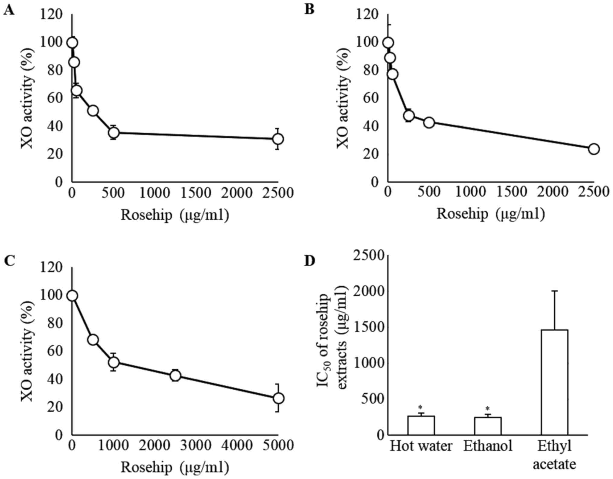 The measurement of XO activity was performed in accordance with previously published methods with modifications (40). Briefly, 151.5 µl Tris-HCl buffer (pH 7.5; 100 mM), 7.5 µl XO (0.4 U/m) in 50 mM Tris-HCl buffer (pH 7.5), and 9 µl rosehip extracts [concentrations, 10, 20, 50 and 100 mg/ml (final concentrations, 500, 1,000, 2,500 and 5,000 µg/ml, respectively) in the ethyl acetate extract, and 0.5, 1, 5, 10, 50 mg/ml (final concentrations, 25, 50, 250, 500 and 2,500 µg/ml, respectively) in the hot water and ethanol extracts] were mixed in 1.5-ml tubes. These tubes were pre-incubated in a heat-block at 37°C for 5 min. Subsequently, 12 µl xanthine (80 µM) in 25 mM NaOH was added and incubated at 37°C for 30 min. The tubes were incubated at 100°C for 1 min to terminate the reaction. To measure the quantities of urate production, the Urate C-test Wako kit was used according to the manufacturer's protocol. The relative XO activity was expressed as a ratio of the absorbance of each rosehip extract group to that of the corresponding vehicle control group (MilliQ-water or DMSO). The half maximal inhibitory concentration (IC50) values were calculated from the XO activity curves.
