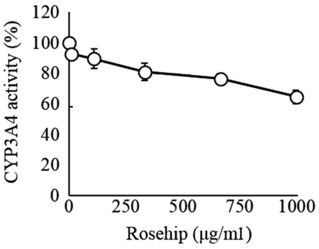 The addition of rosehip hot water extract tended to decrease the CYP3A4 activity in a dose-dependent manner, although this decrease was not significant (Fig. 4). Furthermore, at the highest examined concentration (1 mg/ml), rosehip hot water extract inhibited only 40% of CYP3A4 activity (IC50 value, >1 mg/ml).
