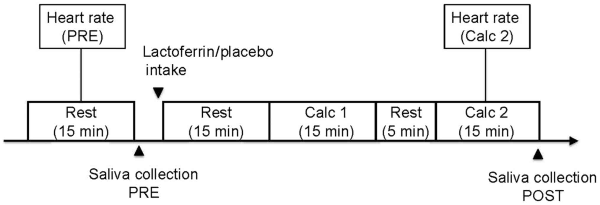 On the experiment day (Fig. 1), subjects visited the institution at 8:30 a.m., wore a heart-rate monitor (RS 800CX; Polar Japan, Tokyo, Japan) and rinsed their mouths with water. Each subject was quietly seated for 15 min, while stabilizing the respiratory rate to breathe once every 4 sec (equivalent to 0.25 Hz) using metronome software (Art Metronome version 1.8; obtained from http://www.asahi-net.or.jp/~hb9t-ktd/music/Japan/Soft/metronome.html; accessed July, 2015). Heart rate was recorded during this rest period [Pre-condition (PRE); Fig. 1]. Saliva (~2 ml) was then collected (PRE) using Salivette® (Sarstedt AG and Co., Nümbrecht, Germany), followed by an oral ingestion of either bovine lactoferrin or a placebo (details provided below). Following the ingestion, subjects remained seated for another 15 min while maintaining the respiratory rate at 0.25 Hz, and began a calculation task. The calculation task comprised of two sets of 15-min calculations with a 5-min interval between sets. In each set of calculations, subjects attempted to solve 60 questions involving multiplications and divisions using pairs of three-digit numbers. Heart rate was recorded again during the second calculation set (Calc 2). Upon completion of the calculation task, subjects rinsed their mouths with water and provided saliva (~2 ml) post-condition (POST) using Salivette®.