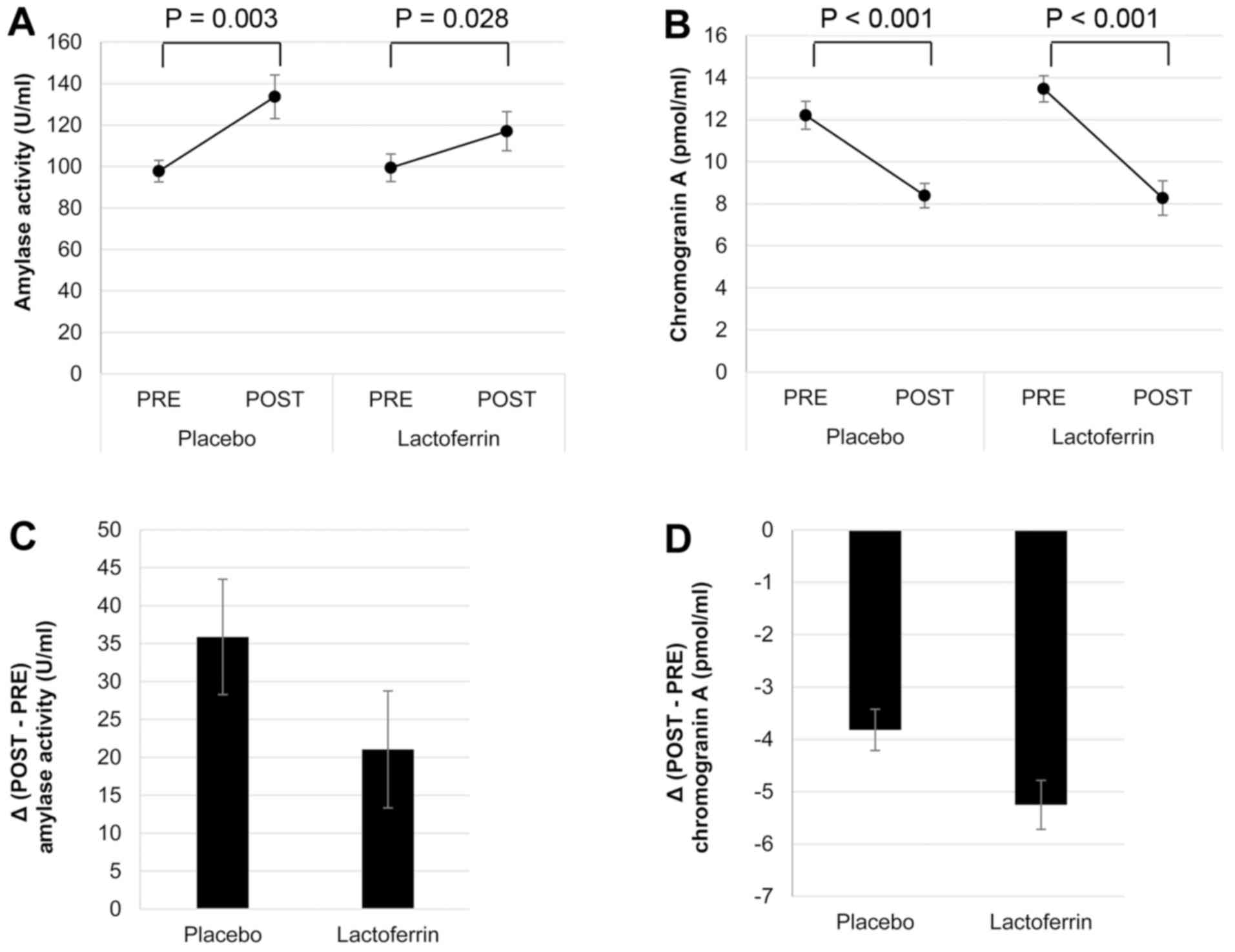 For both placebo and lactoferrin treatment conditions, following the calculation task (POST), amylase activity was elevated (P=0.003 and P=0.028, respectively; Fig. 2A), while chromogranin A concentration was reduced (both P<0.001; Fig. 2B).