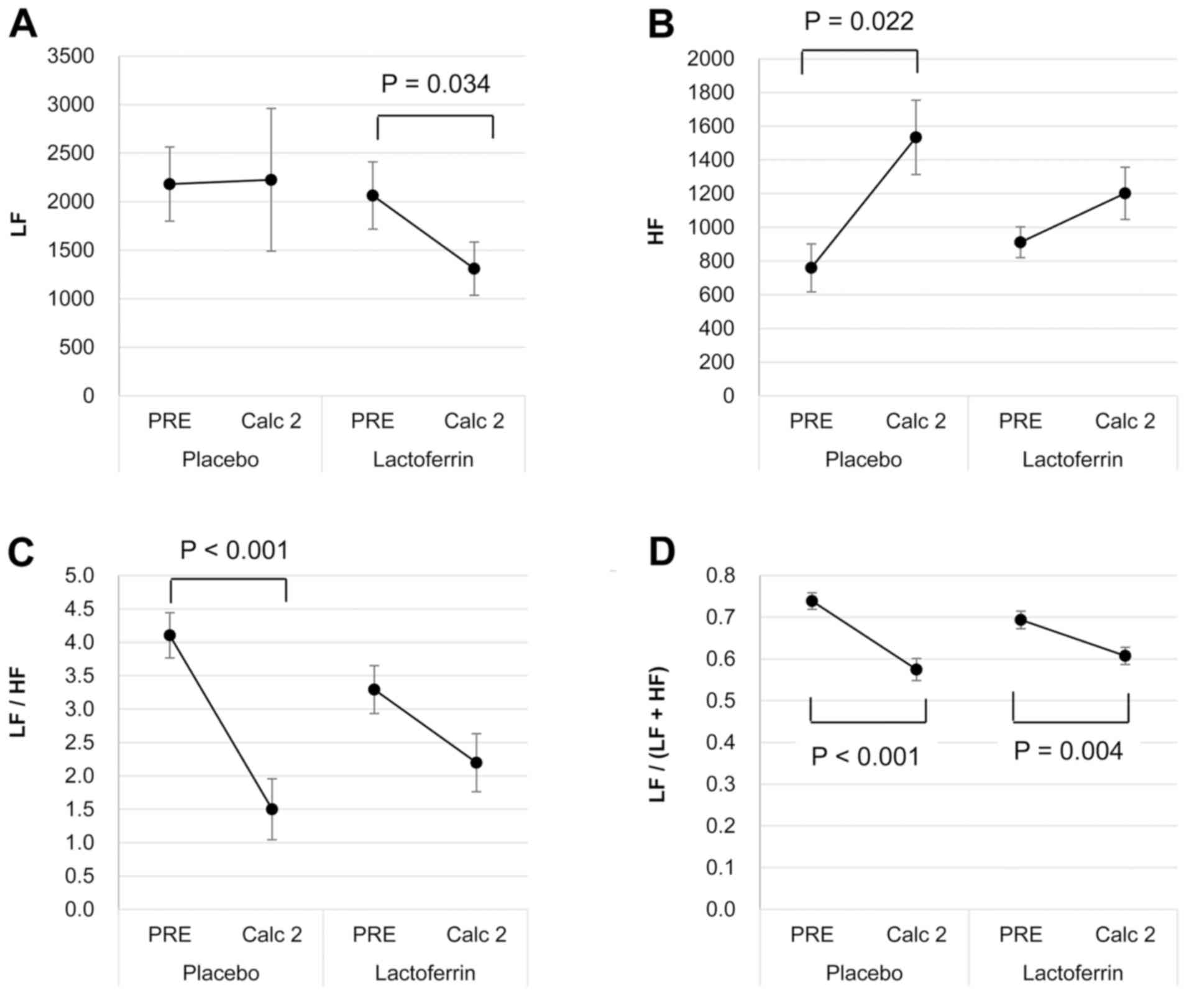 To the best of our knowledge, the present study is the first to investigate the potential of lactoferrin for managing psychological stresses incurred during human activity, using the aforementioned heart rate variables and salivary stress markers.