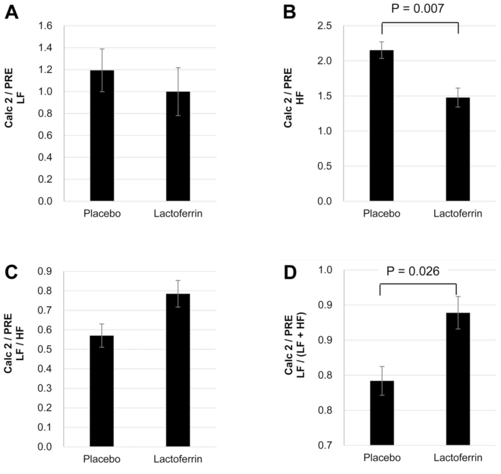When changes in heart-rate variability parameters were expressed as ratios (Calc 2/PRE; Fig. 4), lactoferrin ingestion was identified to significantly attenuate the elevation in the HF component (P=0.007; Fig. 4B) and the reduction in the LF/(LF+HF) ratio (P=0.026; Fig. 4D) compared with the placebo treatment.