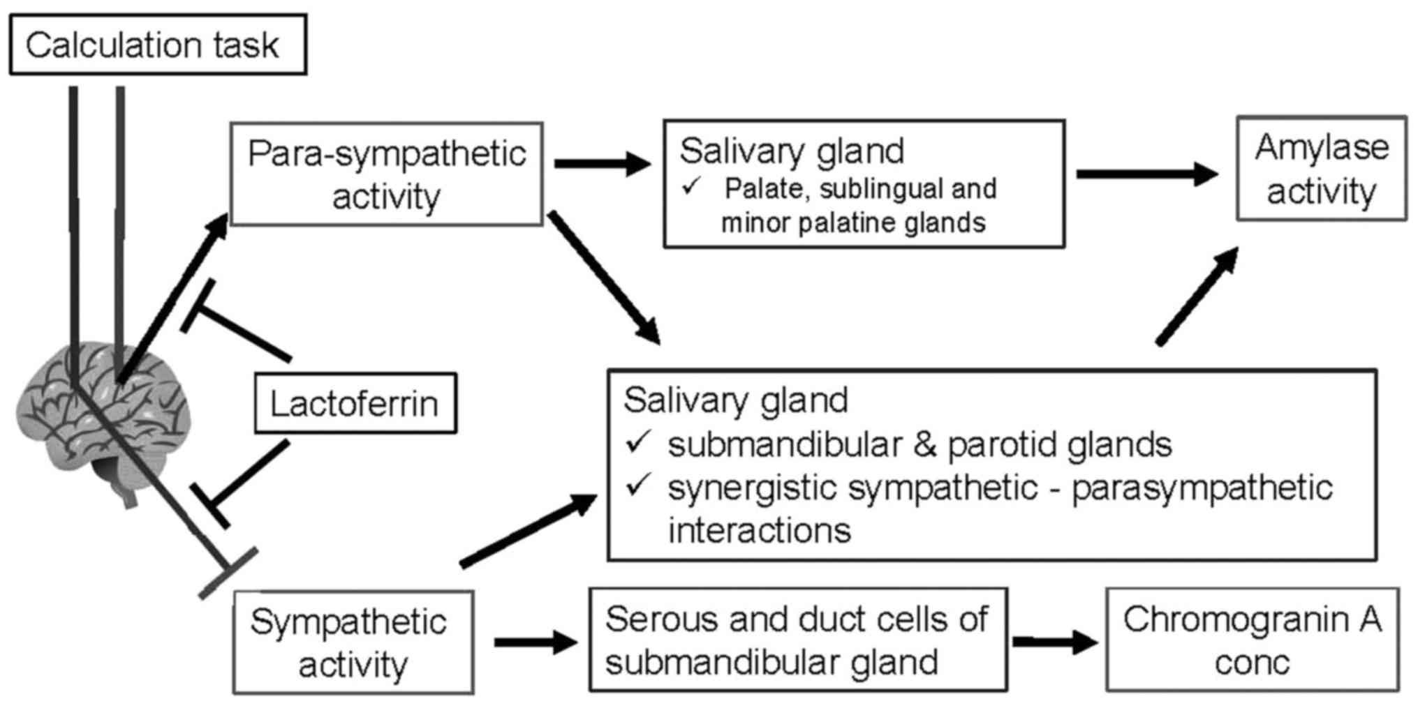 A single-dose cross-over study was conducted to assess the influence of oral lactoferrin on psychological stresses incurred by a calculation task. The calculation task resulted in upregulated parasympathetic activity that increased salivary amylase activity, and downregulated sympathetic activity that reduced chromogranin A concentration. Oral lactoferrin ingestion suppressed the changes in parasympathetic and sympathetic activities evoked by the calculation task. These findings indicate the possible application of lactoferrin in managing psychological stress.