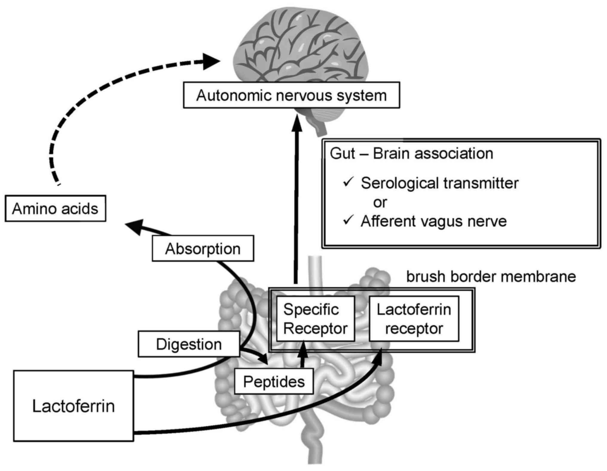 As lactoferrin is a protein with a molecular weight of 80 kDa, it should be digested into smaller peptides or amino acids prior to absorption. Certain reports have described milk-derived peptides exerting biological activities other than nutritive value (25–28). There may be a peptide derived from lactoferrin that binds to a specific receptor to modulate autonomic nervous activity; however, the absorbed amino acids are unlikely to have such specific roles (Fig. 6).